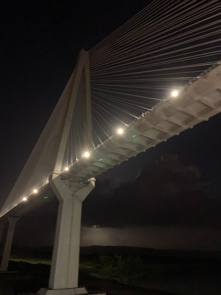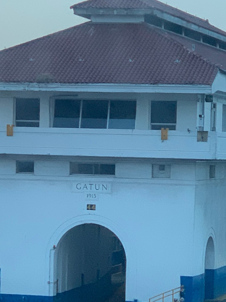 So, we lined up for the ‘north’ bound (right) lane. Interesting, I always thought it was east to west (which the full transit is), but if you look at a map of the locks, it actually goes from a south to north bound direction. The sun started to come over the horizon just as we were entering the locks. The light was beautiful. The ‘mules’ (small train-like machines) connected a cable to the ship, both front and back, that keep the ship safely moving through the locks without hitting the sides and causing damage. Into one lock, up we went, into the second and third and into Gatun Lake (85 ft total elevation). There we saw very large cargo ships waiting their turn to enter the locks southbound.