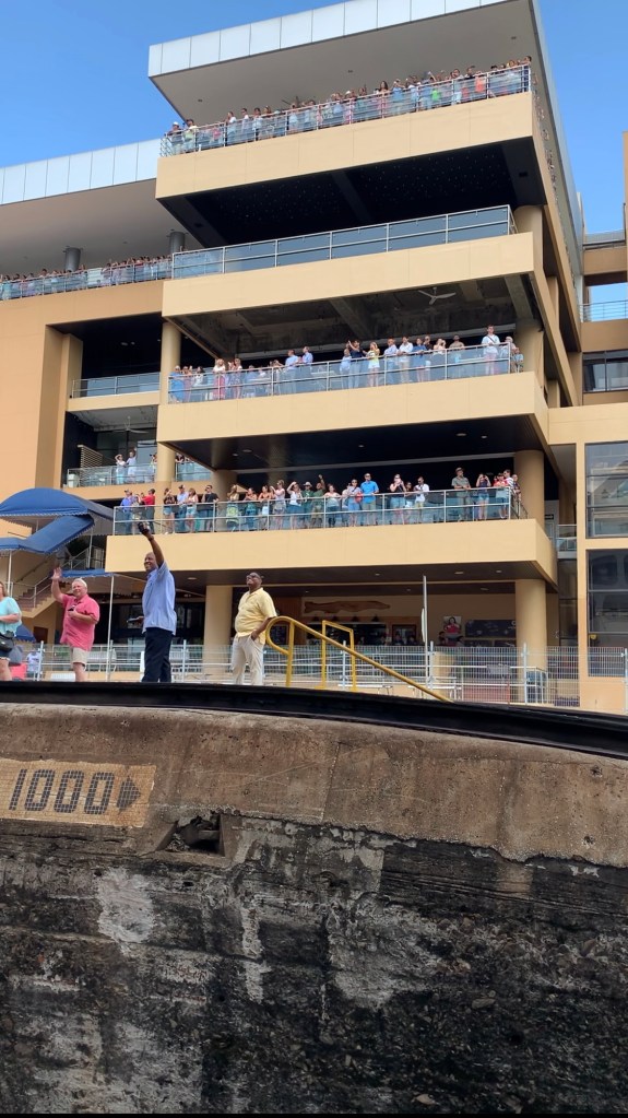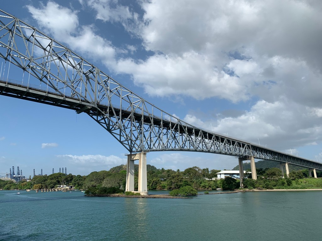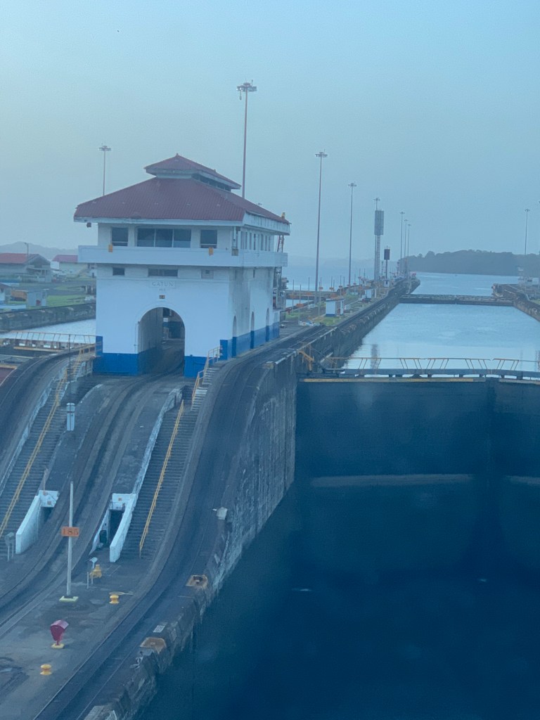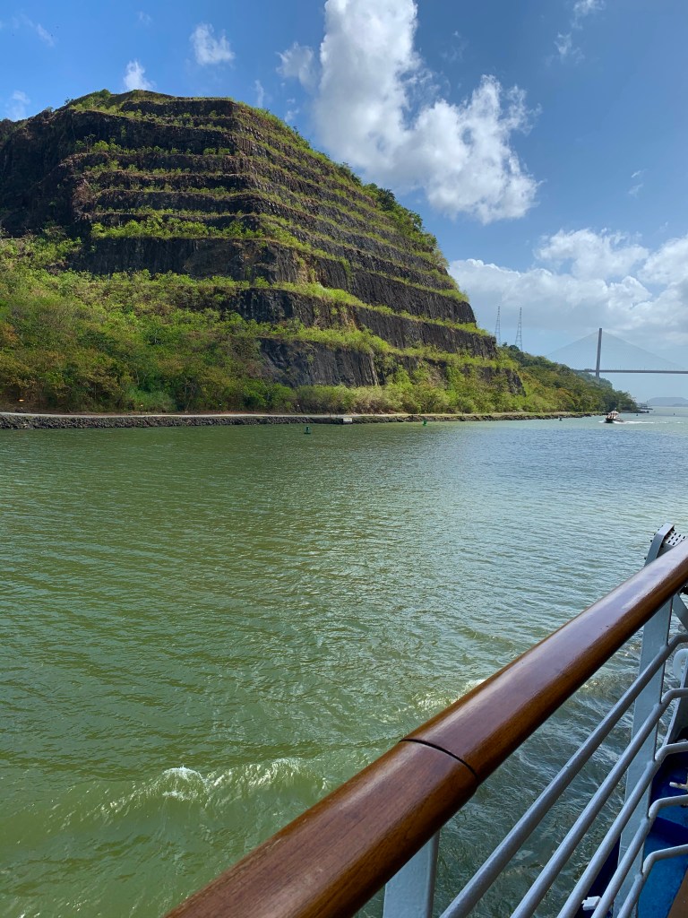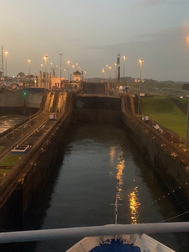 We slowly went through the lake, seeing many beautiful islands, full of thick vegetation (one of them used by the Smithsonian Institute to study plants and animals of the region). As you leave the lake, you go through the Culebra Cut for over 7 miles and it crosses the Continental Divide. Now we’re heading toward the Pedro Miguel locks (1 stage lock) and passing under the Centennial Bridge. The Miraflores Locks (2 stage) is 1 1/8 mile long. As we passed into the locks, there was a huge viewing platform (many stories tall) with a huge crowd watching. As we approached, they announced us. “Please welcome the Pacific Princess starting their 111-day World Cruise”. They all cheered and waved. We all waved and were close enough to shout our hellos back and forth.