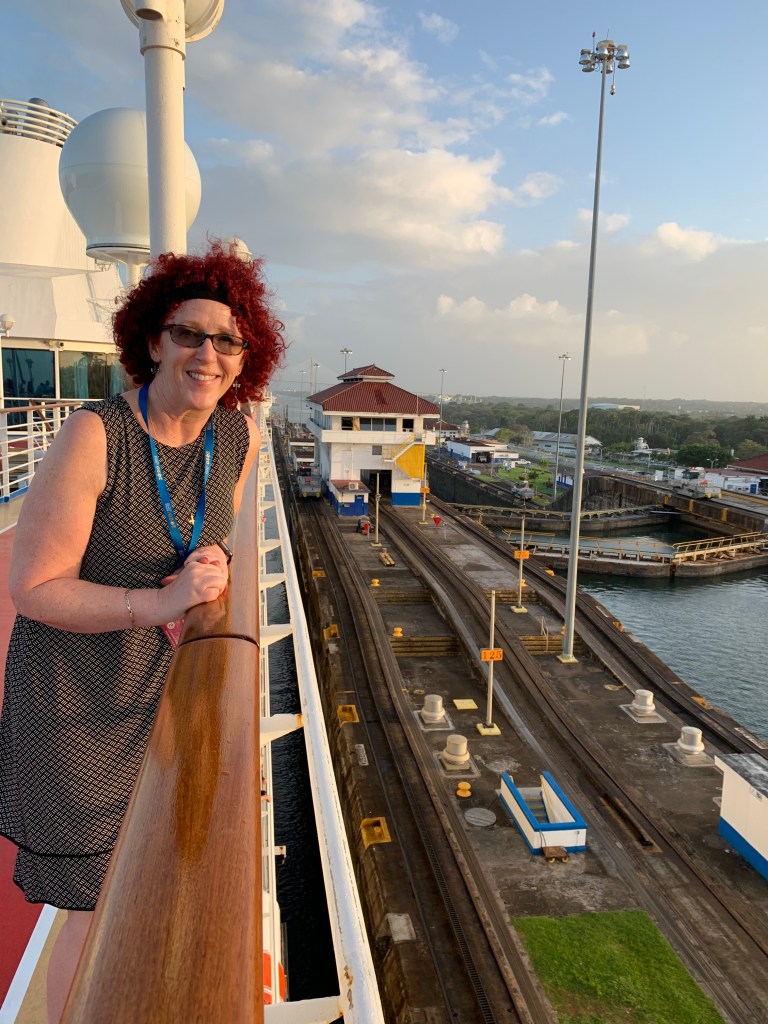 Friday, January 10th – Bob and I set the alarm for 5 am. We didn’t want to miss a thing. Went up to top deck into warm darkness and then saw the beautiful moon shining across the water. In the distance we could see a bridge with subtle lighting (Atlantic Bridge). We approached and quietly went under the bridge and there it was, the Panama Canal! The pilot boarded our ship to take us through the transit. We were lining up for the Gatun locks and yet your brain is saying, it doesn’t look like we’ll fit (it’s only 110 feet wide)! I guess after 106 years, they certainly know what they are doing.