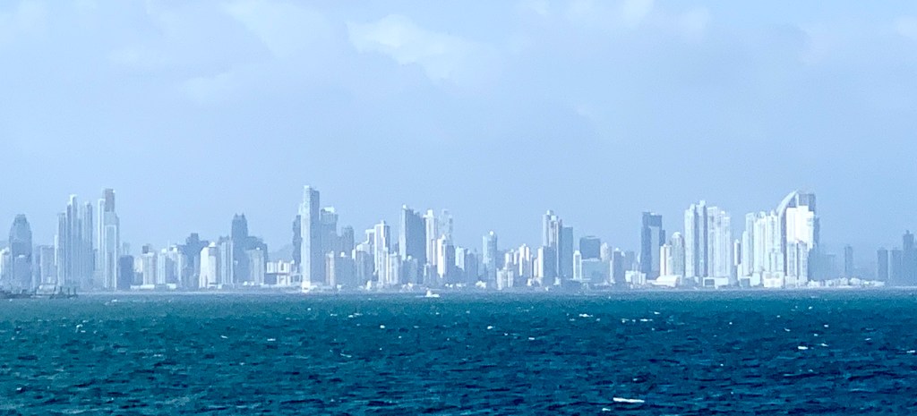 Here we are, from Atlantic to Pacific Ocean in just a little over 8 hours (50 mile transit total). As we left the locks and entered the Pacific, I was surprised to see Panama City and what a large city it is. The sun was hitting the buildings and skyscrapers were sparkling like diamonds with some very dramatic clouds in the background.