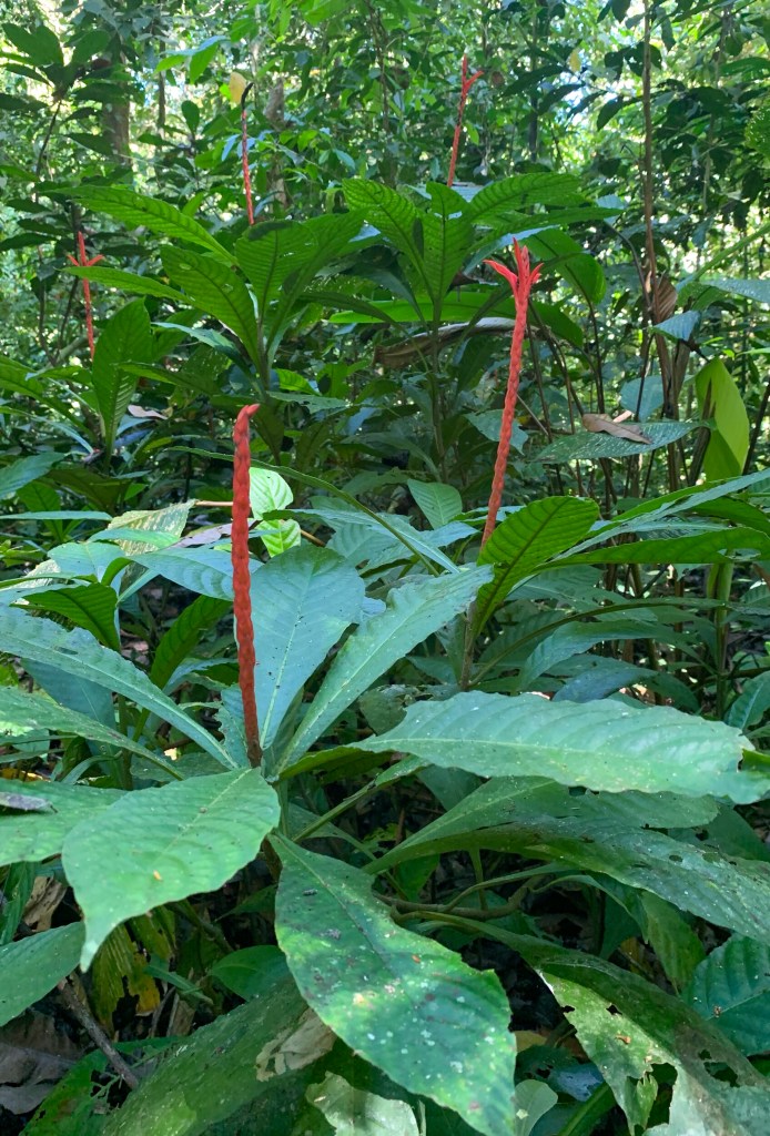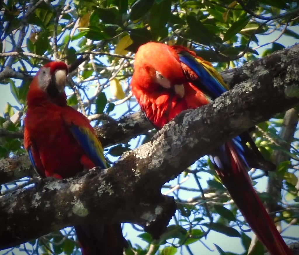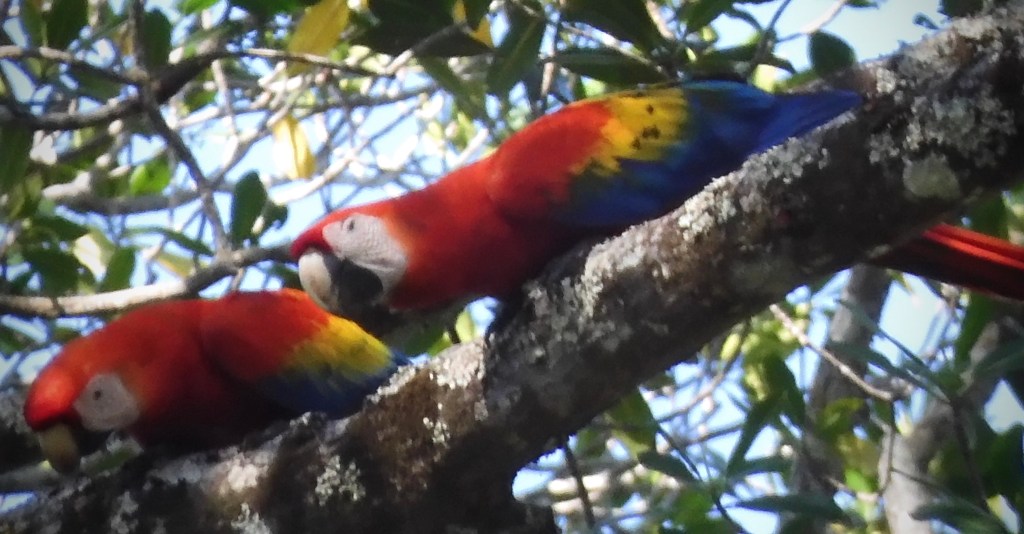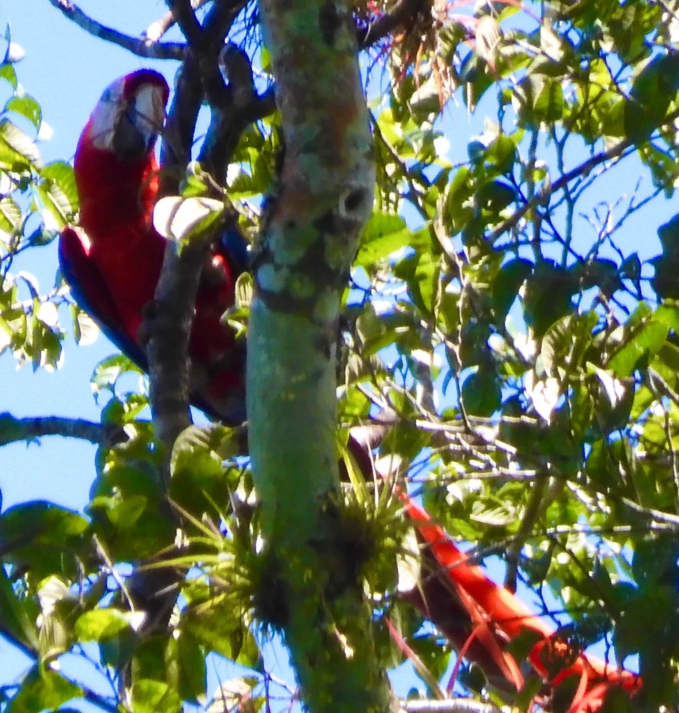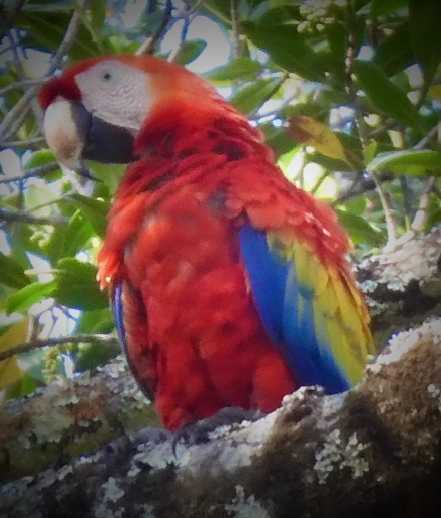 We took a hike into the rain forest where our guide told us about the many species of trees and plants. Our group was also looking for any wildlife. I spotted a large parade of leaf-cutter ants. I remember seeing them in the rainforest before and found them very entertaining. They were following each other in a line that seemed a mile long, down the trunk of a tree, across our path and out into the jungle, each carrying a piece of leaf. If you didn’t look close to see the ant, it was like a dancing line of green leafs. We looked for sloths but didn’t find any. Luckily, this park is home to one of the largest remaining populations of wild scarlet macaw in Costa Rica. Sure enough, soon we heard the macaws screaming in the tree tops and with that bold red color, they were easy to spot. What a gorgeous creature! They were so far up in the tops of the trees, it was difficult to get a picture.