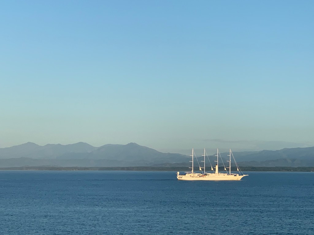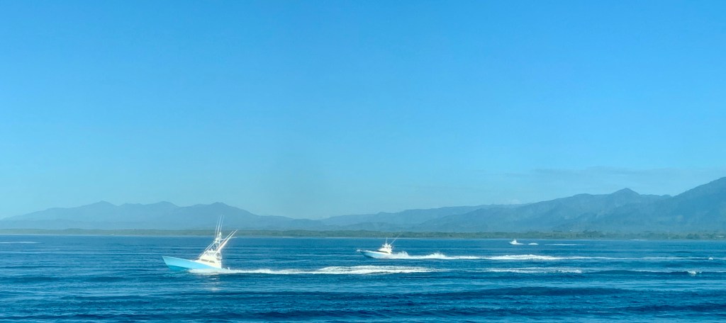 Arrived in this beautiful port at sunrise on Sunday morning. It was magical! The mountains (volcanos) in the distance with a misty look about them. The ocean was beautiful blue and peaceful. Suddenly we heard a roar and on both sides of the ship, fishing boats racing out to sea. We arrived on the last day of a fishing tournament (good area for Marlin).