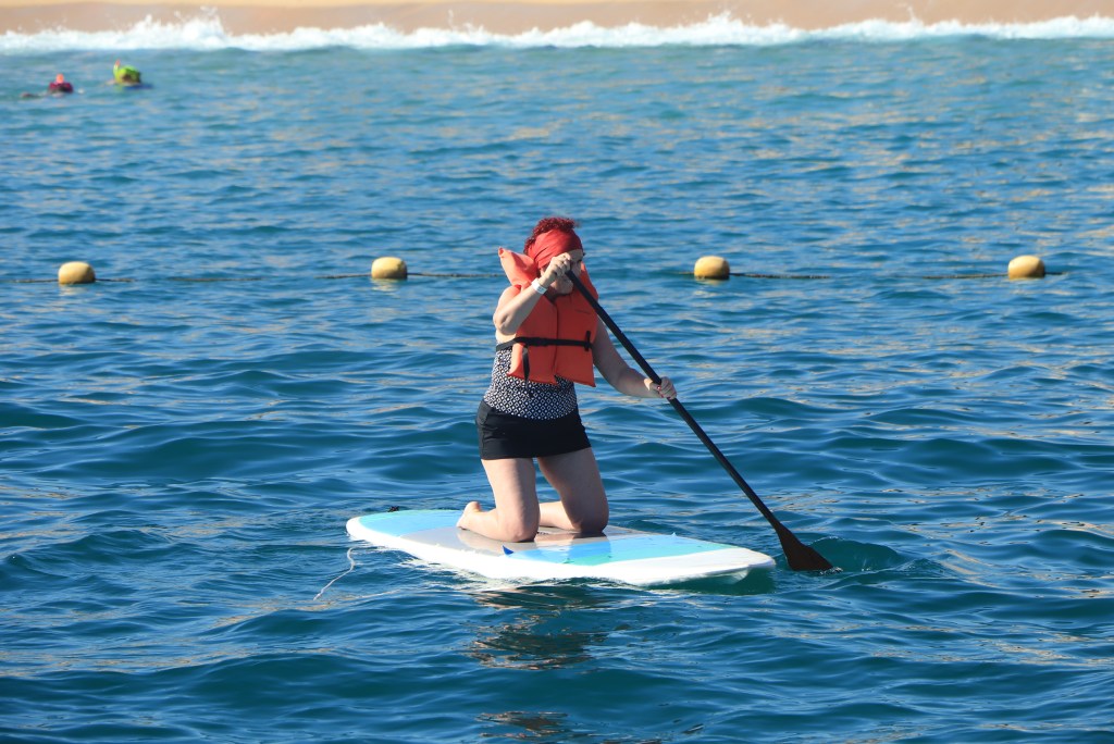 We arrived at Santa Maria Beach where we dropped anchor. I asked the captain if he would teach me to paddle board, so he gave me a quick lesson and off I went. I was fine paddling from the standing knee position, but when I went to standup in choppy water, I fell in. I crawled back up and tried again, boom, in the water, not twice but three times. I decided to paddle around on my knees and then came in for lunch. I’m determined to conquer this paddle board, but need to try in calm water on my next try.