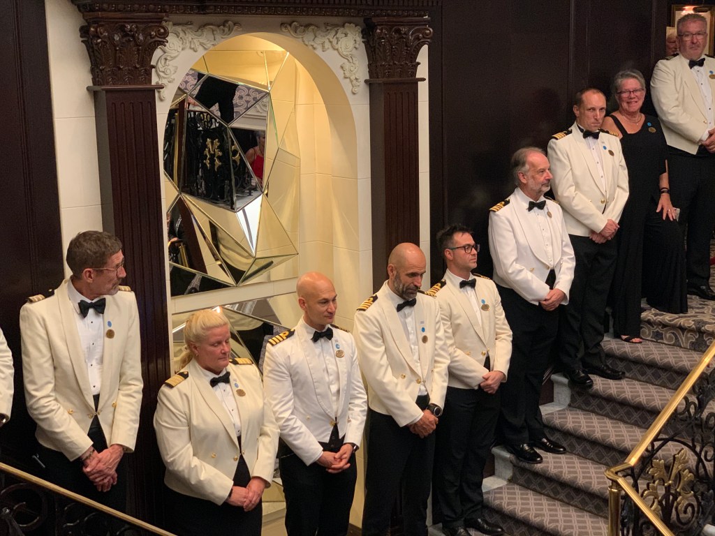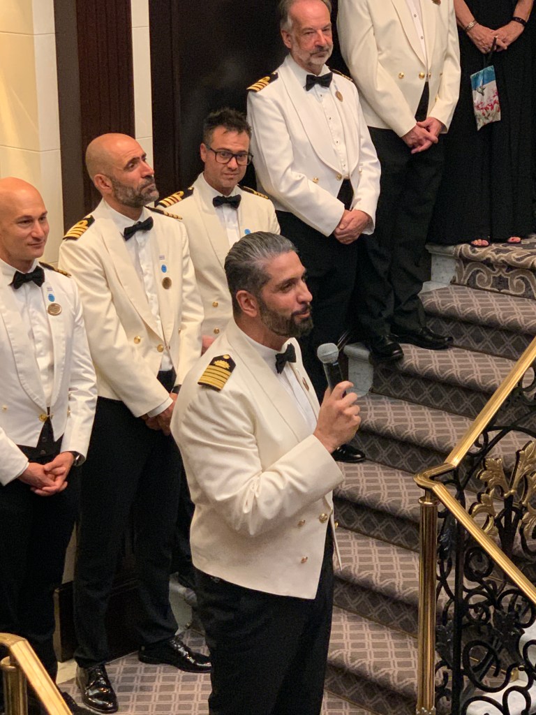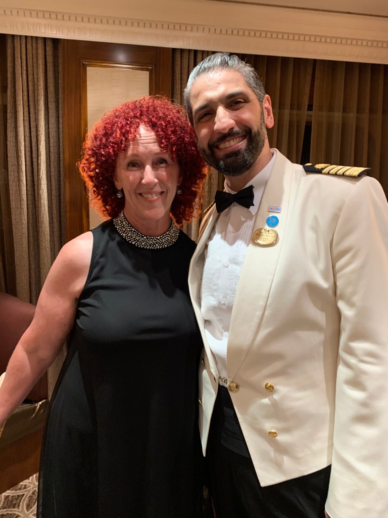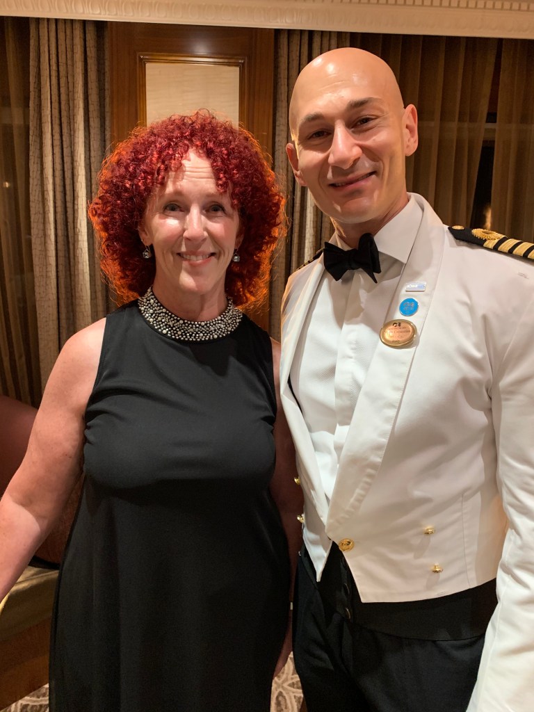 We’ve never been on a cruise where the Captain is so involved with the passengers. Each day at noon, he gives a navigational report from the bridge. He has a great sense of humor and always makes us laugh. His name is Captain Paolo Arrigo and hails from Messina, Sicily. In 1998, he followed his family’s heritage of working for Princess, making him the third generation to choose a career at sea. We see him in the gym, walking the deck and regular visits during evening dinner. He walks through the dining room with his first officer to make sure all the passengers are enjoying their time aboard. As he puts it “enjoy your day on the maaaavelous Pacific Princess”.