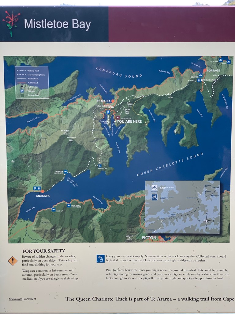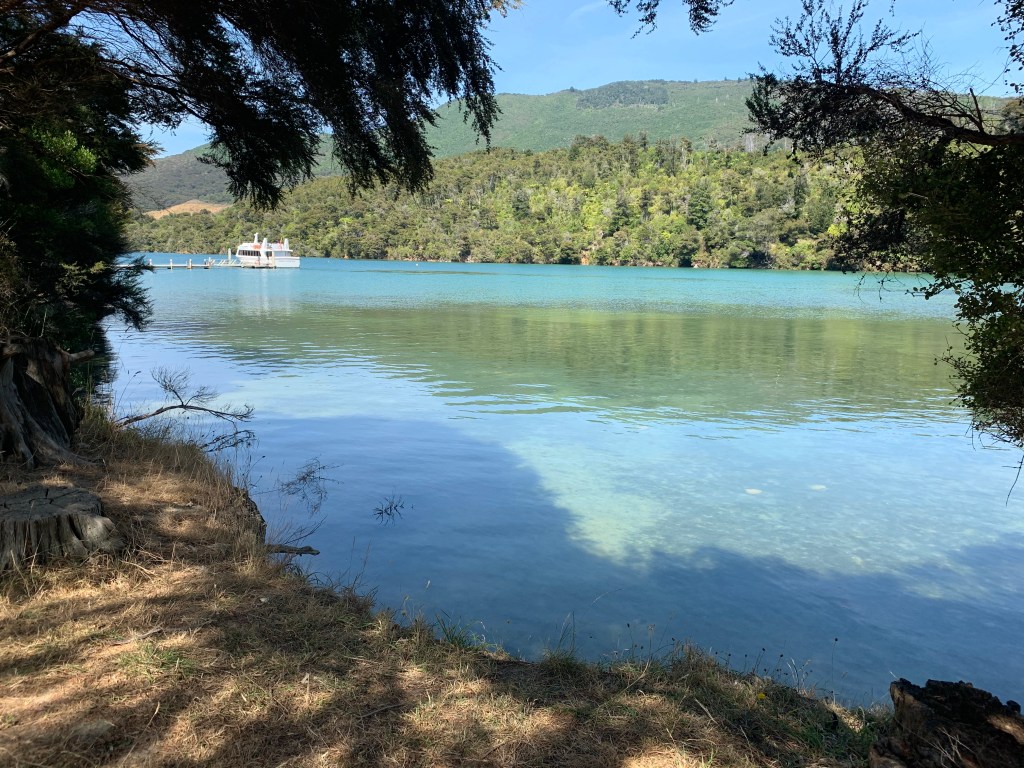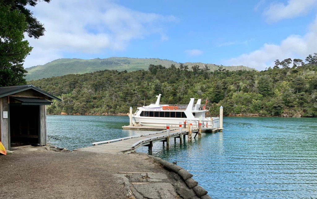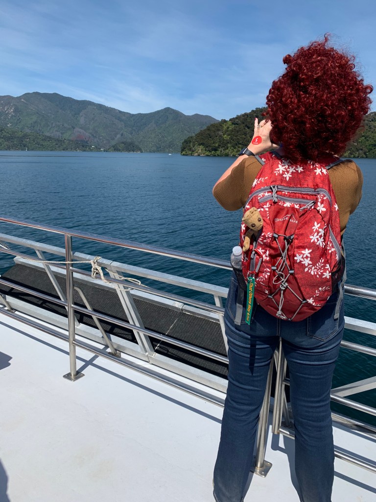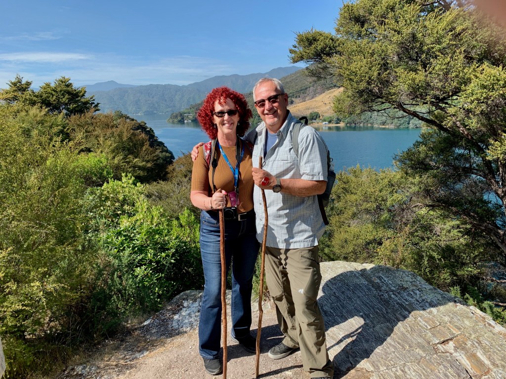 Bob and I took a tour today where we boarded a small boat, crossed the sound and hiked part of the Queen Charlotte Track along the beautiful coastline at Mistletoe Bay. The ride across the sound had spectacular views, rocky bays and hidden coves. Beautiful mountains surrounding us with lush greenery and blue skies.