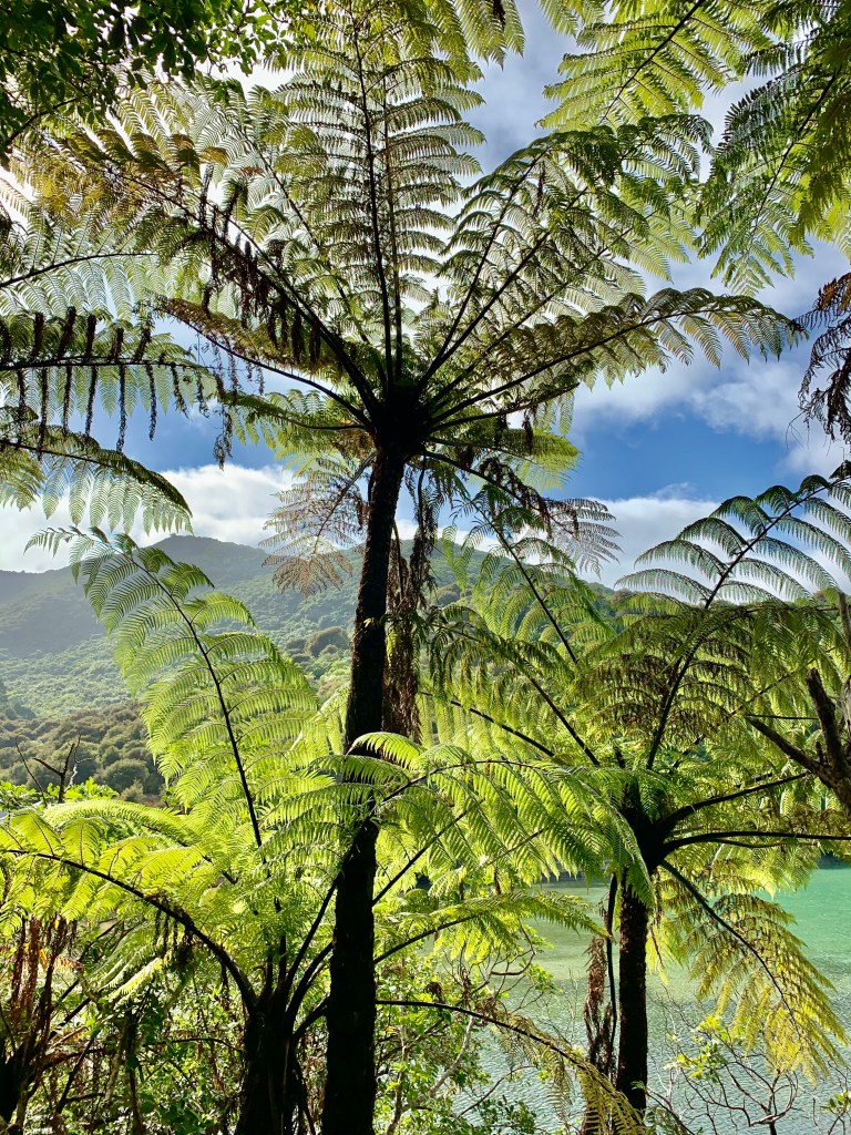 Our guide (Grant) took a small group of us through the ‘bush’ on a rocky trail that climbed from the shoreline up to some rocky overlooks. As we walked, he would tell us about the foliage. I loved the giant tree ferns that formed a canopy above us, the silver ferns (one of NZ’s famous symbols), giant black Beech trees and wild flowers. It was like a fairy-tale. We climbed high and looked out over the water and then back down, what seemed like a new trail. Sure enough, Grant explained the trails in this area only last a few years due to earthquakes. The ground is soft and unstable so they have to rework the trails every few years. Grant also explained they have no snakes or any other creatures in that area that can harm us, only mosquitoes.
