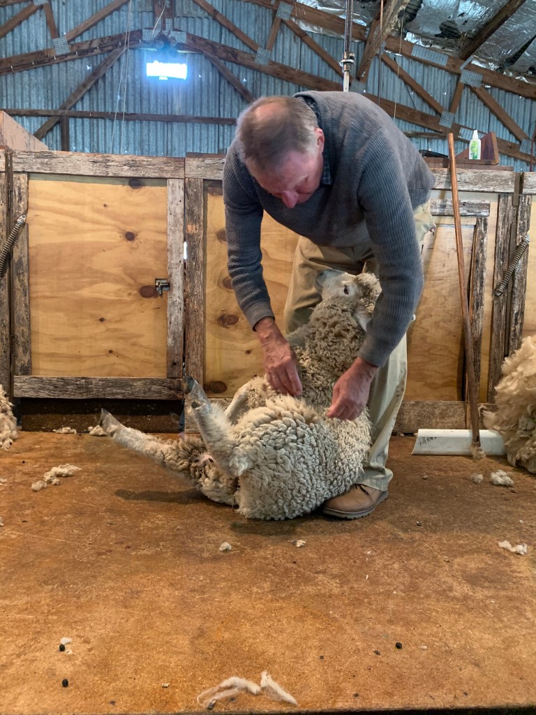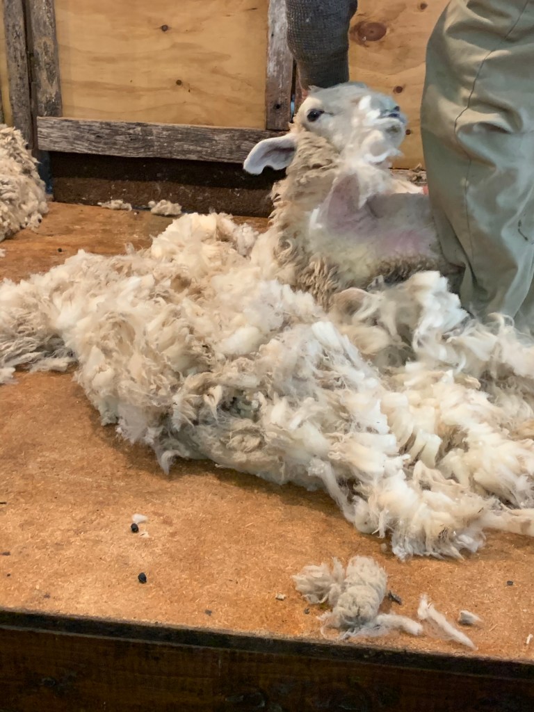 We then went into the barn and he showed us how to shear a sheep. It only took him a few minutes and there stood a naked looking sheep and one big pile of wool. He sells many lambs for meat and has a huge herd used for wool. Yearlings have a high quality of wool because all the nutrients go to the wool and not to producing a lamb. At that point, I thought I should leave the barn. My hair was pretty big that day and Bob thought the farmer may want to shear my head for a red sweater :0