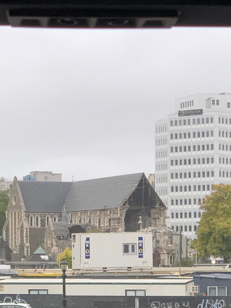 We thanked the couple and left for our drive back to Christchurch. As we went, our guide told us some of the places we would be seeing. In February 2011, Christchurch had a devastating earthquake. I didn’t realize how big until we started seeing the big, open lots in the downtown area. So many buildings totally gone. The tall, beautiful cathedral with huge gaping holes. Heartbreaking! An open lot with 185 white chairs represented a memorial to some of those that died that day. A big, rusty, twisted piece of metal from 911 World Trade Center as a memorial to all the fireman that worked so hard to rescue people. A new house and then an old house. Hit and miss. Many businesses are now located in storage containers. Strange how so many buildings were gone and just one would be standing that was untouched. It’s been 9 years and you can see how much urban renewal is happening and how far they have to go. Our hearts and prayers go out to these beautiful people.