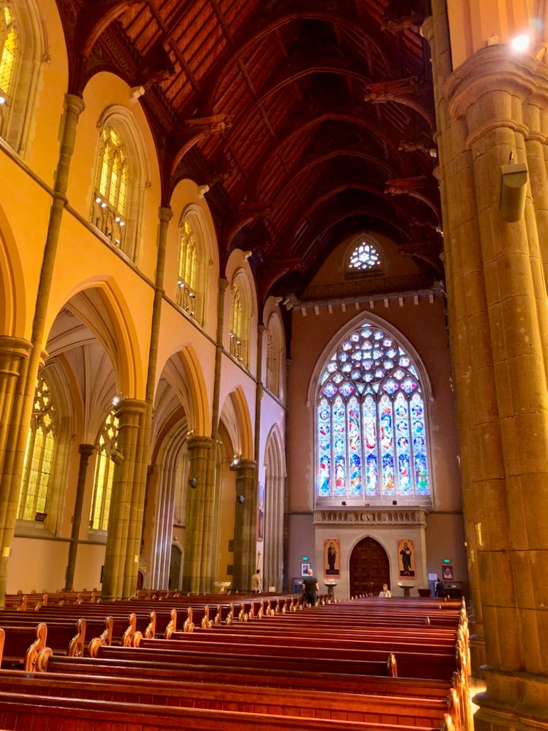 We walked over to St Patrick’s Cathedral.  The sky had changed from grey and cloudy to beautiful blue and clear.  Thankfully as we entered the cathedral, the sun was shining and the stained glass windows changed the atmosphere to a golden glow.  Stunning.  We walked directly across the street to St Peter’s Cathedral.  It was much smaller and very tranquil.  The inside had low ceilings with old beams.