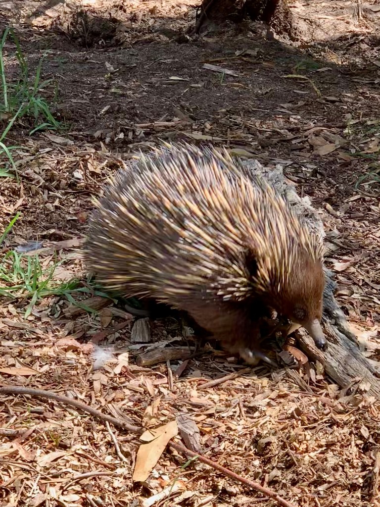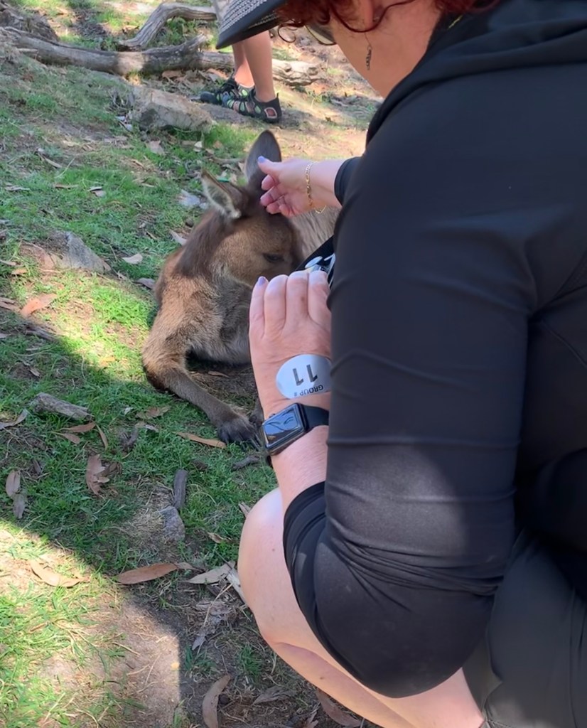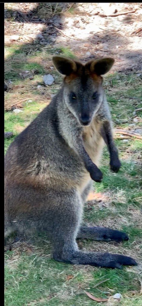 We arrived at the Cleland Wildlife Park that was located at the top of this mountain. It reminded me of the Catskill Game Farm back in New York State. Mom and dad would take us there when we were kids. I have fond memories of going when I was little and then various trips when we took my nieces and nephew. The Cleland Wildlife Park is home to over 130 species of native animals, from venomous snakes (not visiting them) to kangaroos, koalas, echidnas, wombats, emus, dingoes, Tasmanian devils, potoroos and a variety of birdlife. A large portion of the park was open space. You could walk up to the wallabies and kangaroo’s to feed or just pet them.