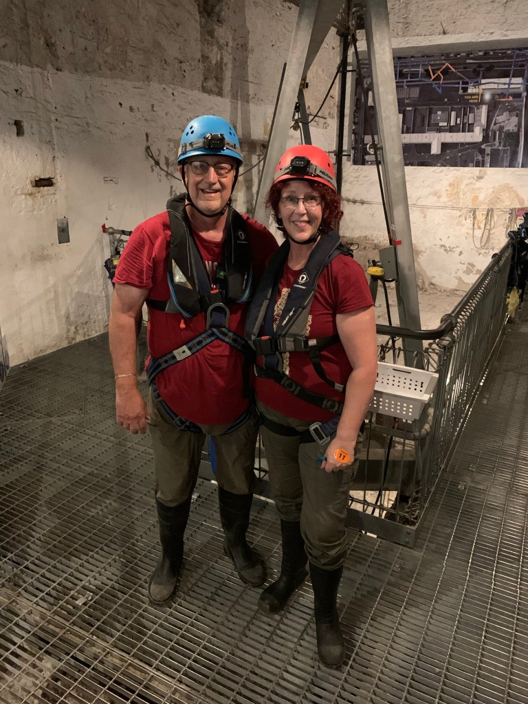 We went up the hill and arrived at the old Fremantle Prison. It was built in 1850s and sits atop a network of tunnels and passageways that form the astonishing labyrinth. We went inside and met our guides. We all understood that this tour was not for those afraid of heights or tight places and you had to be in good physical condition. I was not concerned for us, but was concerned for one woman that was traveling alone. We’ll see what happens. The guide provided us with hard hats with headlamps, boots, safety harness and floatation device. She gave us instructions and then we all took a test. Interesting, a breathalyzer test to make sure there was no impairment issues. Good to go and off we went deep into the tunnels of the prison via a locked ladder system. We began by climbing down the series of ladders (approx 70 feet down). We reached the bottom and began to follow our guide through a maze of tunnels that ranged from 4 to 5 feet high, so bending over as you walked was part of the test too. At one point the guide asked everyone to turn off their headlamps and we all stood in complete darkness for her to tell us stories about the history of the prison. In those days, prisoners would volunteer for this hard labor to reduce their sentence. The tunnels were dug to locate fresh water that was provided to the entire town. In previous years, many died from contaminated drinking water so it was necessary to find a fresh water source which they did under the prison. Our guide said the prisoners used small lanterns for light but if they burned out, finding your way out in darkness was very difficult.