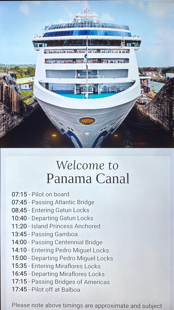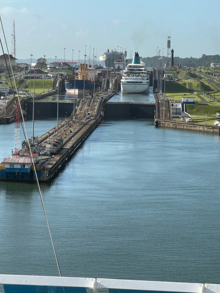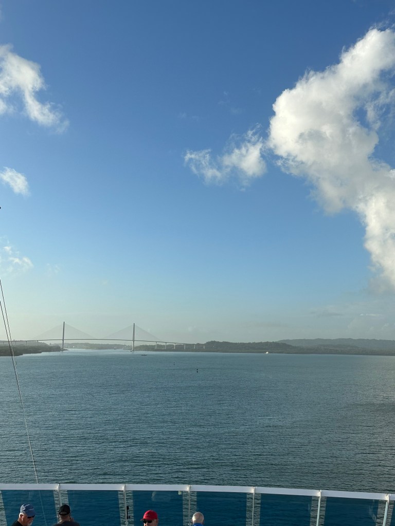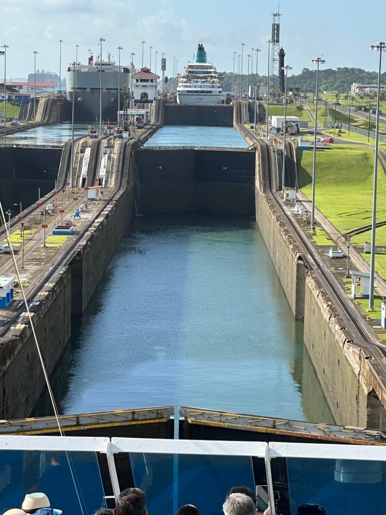 We once again look forward to the Panama Canal transit. What a fascinating process to watch. We went up to deck 15, all the way forward so we didn’t miss a thing. When we entered in the canal in 2020, it was much earlier and it was still dark. This time, it was dawn with a beautiful sunrise. We could see the Atlantic Bridge off in a distance and watched as it got closer. Ahead you could see the canal. The historic canal (original) to the right and the new canal to the left that handles the mega cargo ships. Two ‘pilots’ were onboard our ship for the transit (ship is handed over to the pilots) and the only place where pilots are legally responsible for damage to the ship. It’s absolutely fascinating to watch as the gate opens, the ship slowly moves forward into the locks by powerful diesel/electric ‘mules’ that have cables keeping the ship perfectly centered left/right and front/back. Our ship is the largest allowed into the historic canal. It’s really only an arm’s reach to the wall of the canal and a very delicate process to keep the ship from hitting it.