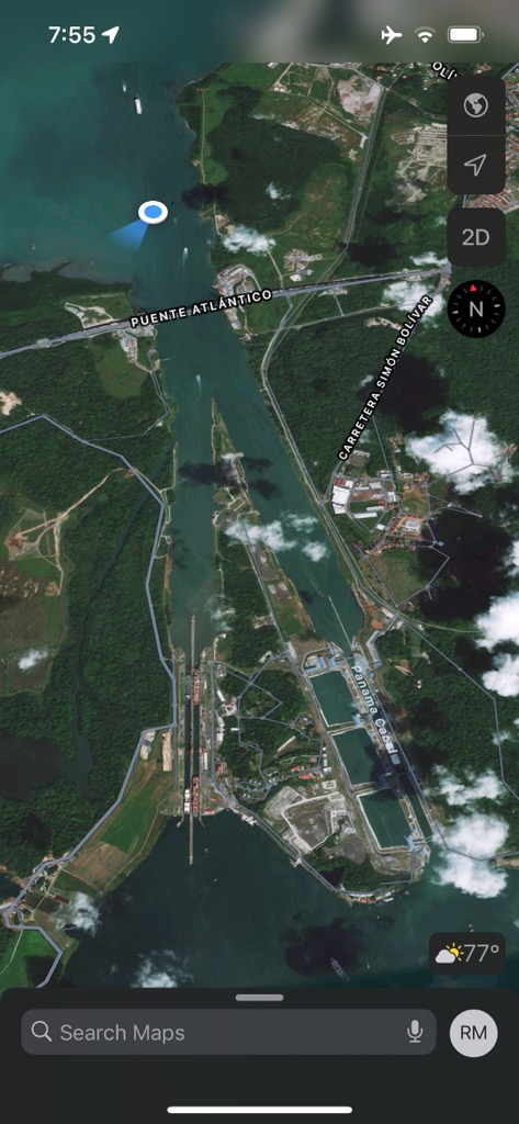 We went through the locks into Gatun Lake. Walked the deck and enjoyed the view. As we left the lake, it becomes narrow, like a river with steep, rocky areas. We went under the Centennial Bridge that crosses the culebra cut. As we approached the Pacific, the sky grew dark and stormy. We passed an observation platform with hundred of people there to view our ship as it went by. We all waved to each other as the ship went through another lock. We passed under the third bridge, ‘Bridge of Americas’ and could see many cars crossing above us. We continued and could hear thunder and saw lightning. Panama City was just barely visible. The wind picked up and as we exited the locks and our ship started drifting. No worries. The pilot requested a tug to give us a push and off we went.