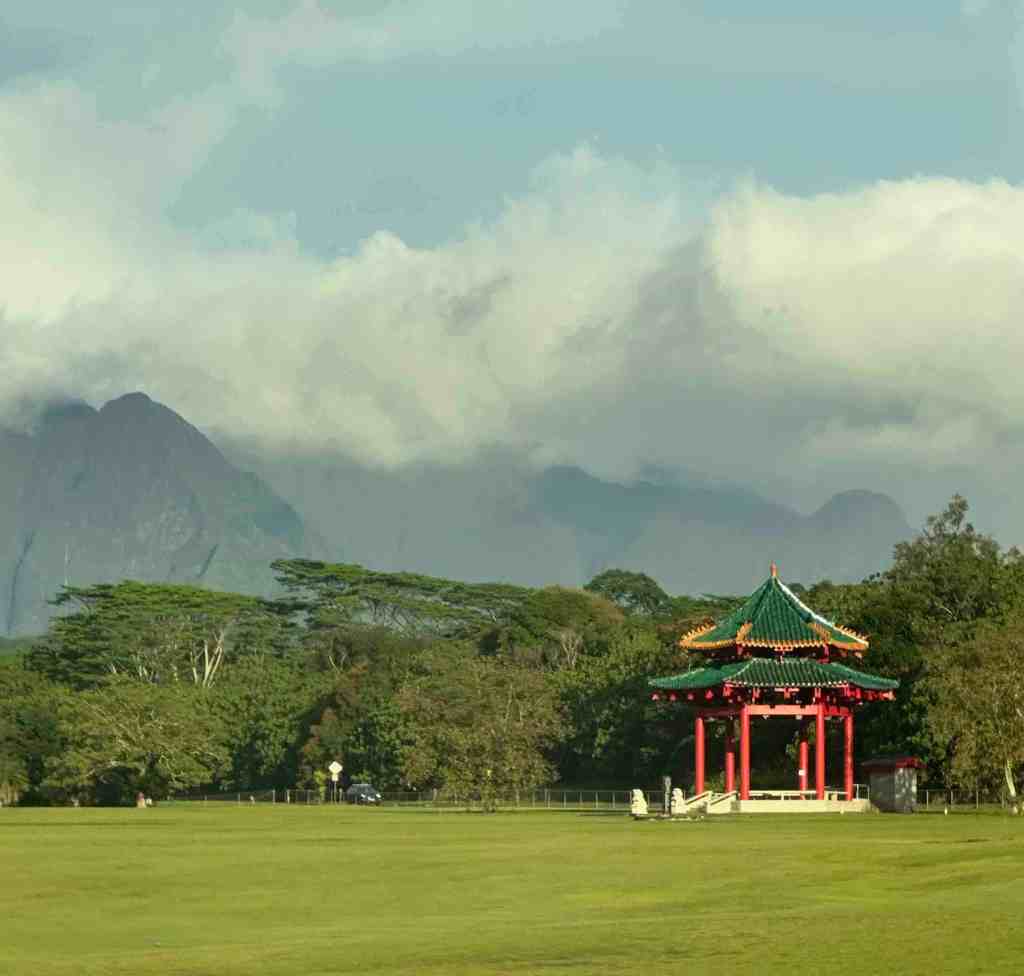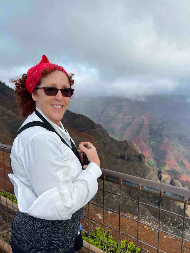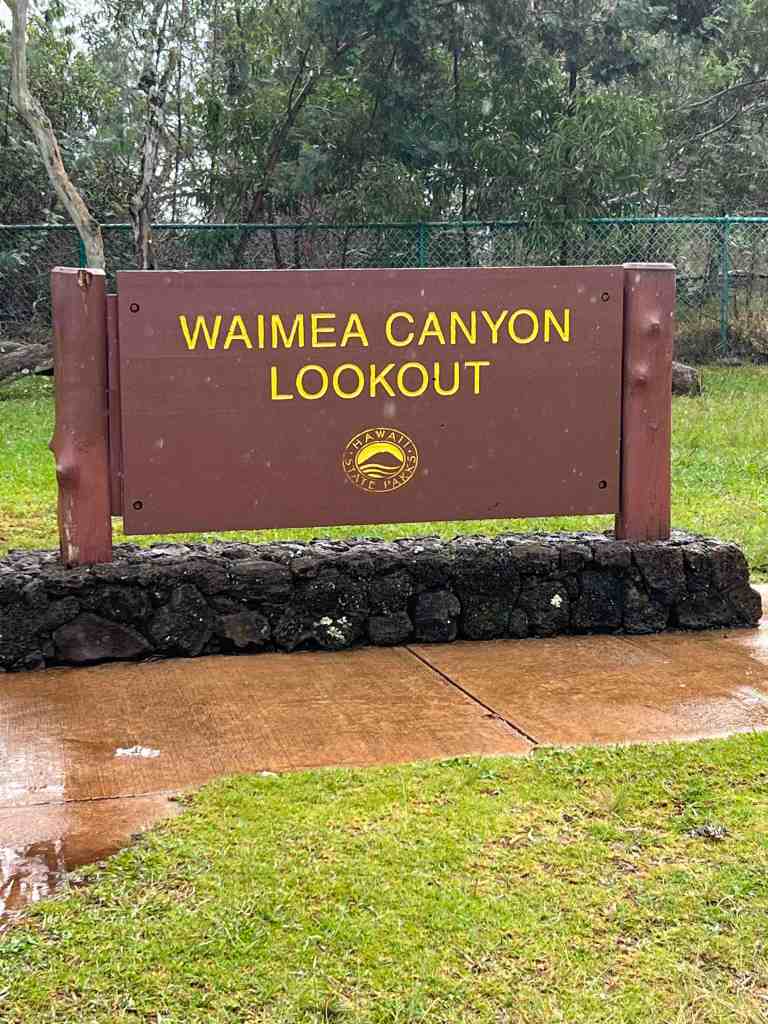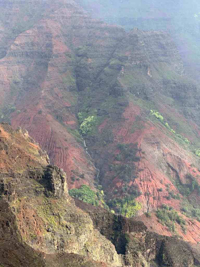 We drove up a mountain with many switchbacks.  We climbed higher and higher until we met the clouds.  We arrived at Waimea Canyon, known as the ‘Grand Canyon of the Pacific’.  It’s 3,567 feet deep, 12-mile long canyon.  The light constantly changing as the mist and clouds were blowing through it.  Off in a distance, you could see a magnificent waterfall.