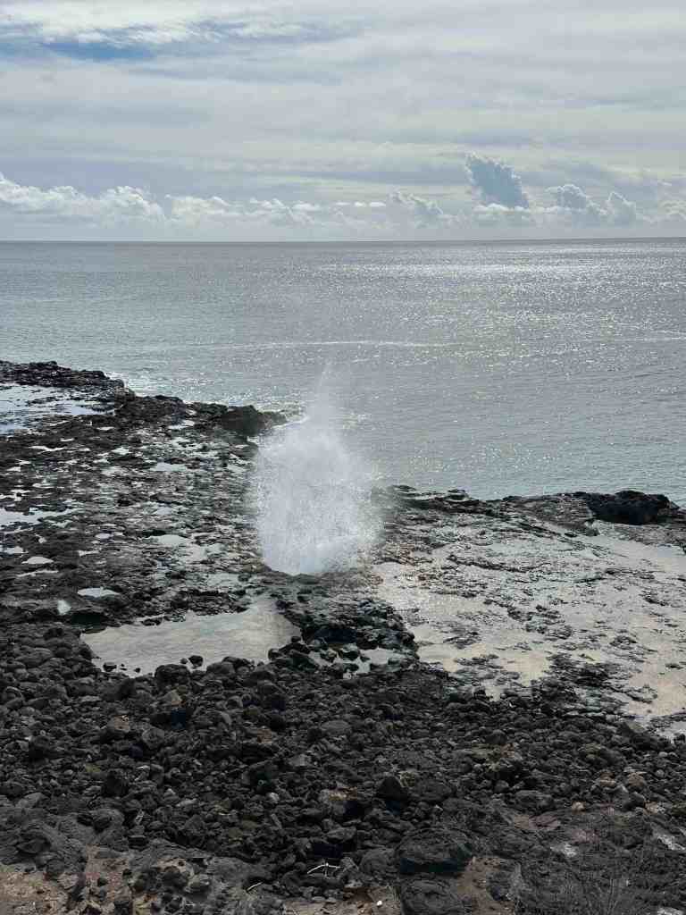 After visiting the canyon, we drove to the south shore and watched these fascinating rock formations (Spouting Horn blowhole).  We watched the blowhole spout a plume of sea water into the air.  It occurs whenever waves are forced under the lava shelf and up through an opening in the rocky coast which makes a loud, blowing sound.  Actually, like a dragon breathing (not that I’ve ever heard that but my imagination said dragon’s breath).