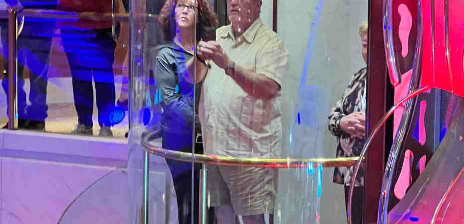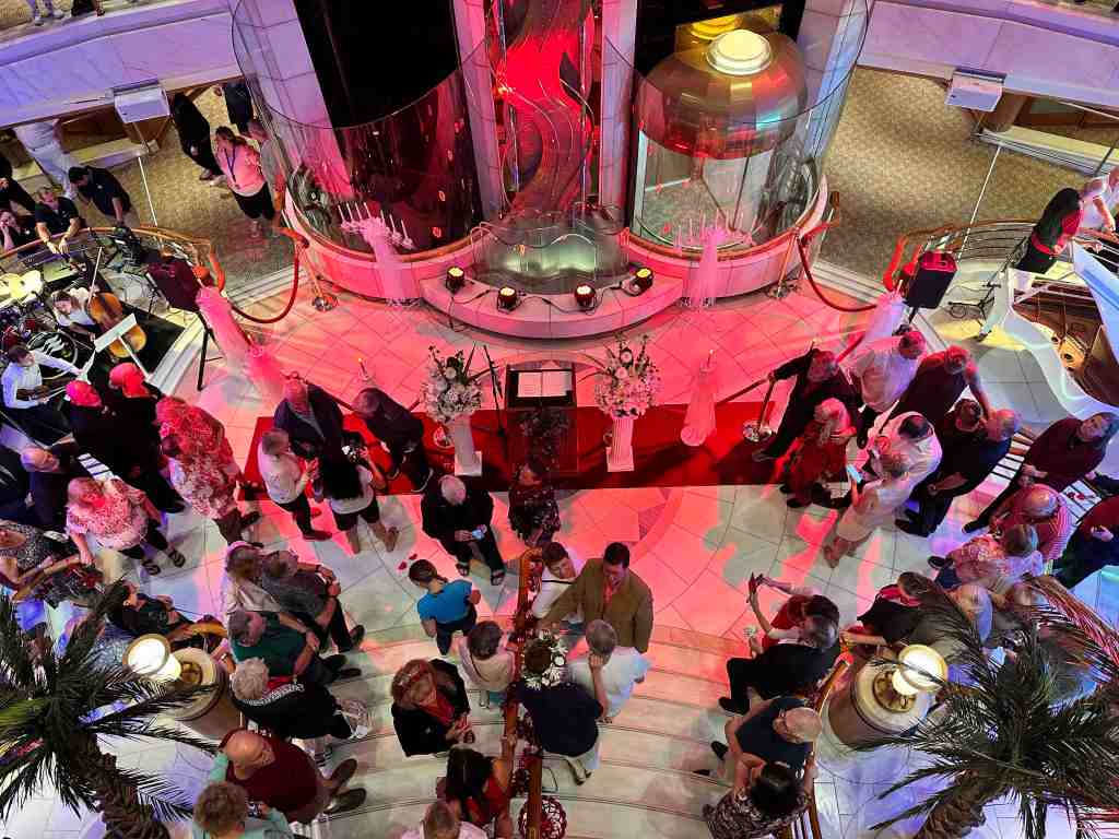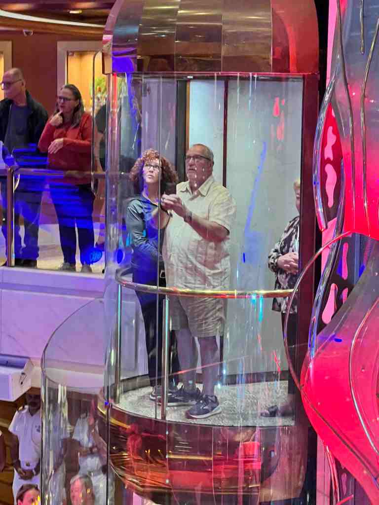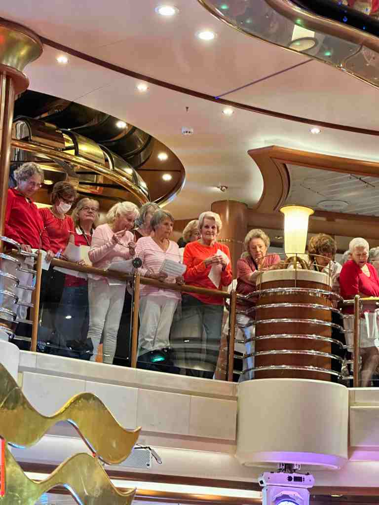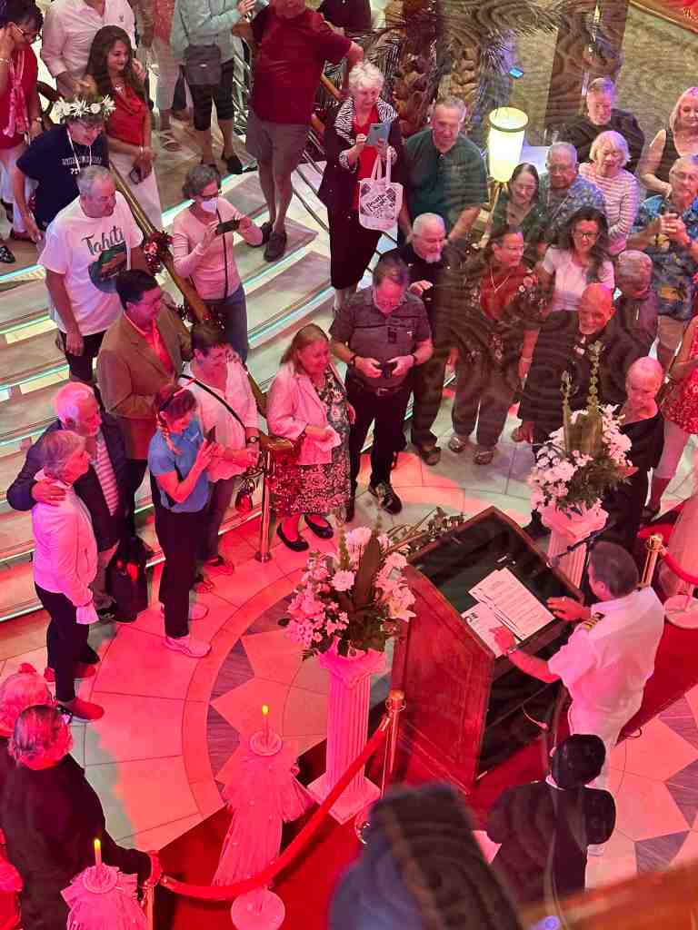 The choir gathered on multiple levels and sang a few romantic, love songs. The Captain said ‘repeat after me’….their renewal of vows and then a flood of red hearts came floating from the sky. Bob and I were riding the glass elevator in the atrium so we had a nice view of the red hearts floating everywhere.