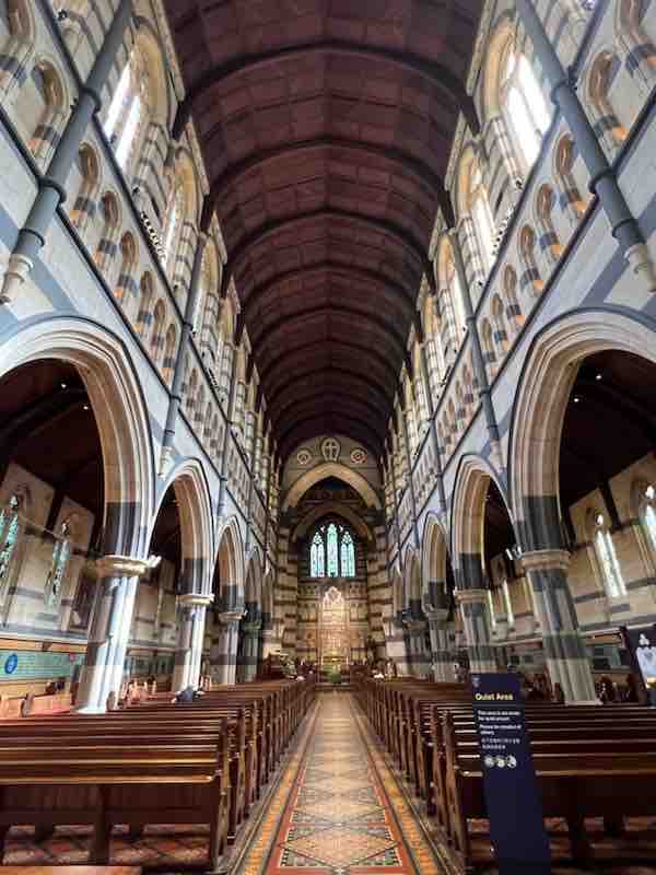 This visit would be different. Four of us took a shuttle bus into downtown and did a walking tour. We’re only here for the day and it happens to be 99F. We took a walk along the Yarra River. Walked across a beautiful pedestrian bridge to a shaded path along the river. We went into St Paul’s Cathedral and took a walk inside. What a beautiful cathedral!