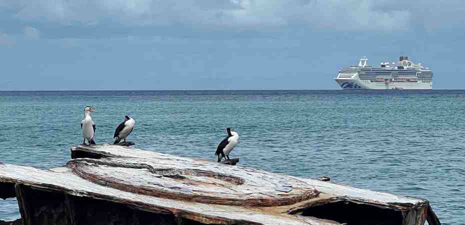 I’m still feeling poorly so I’m asking Bob to go on tour today without me. We anchored and the tenders started taking tourists to the island. Moreton Island is just off the coast of southeastern Queensland near Brisbane. The island offers a resort day at Tangalooma Island Resort. Many passengers went there to snorkel. The island also has huge sand dunes and others went to toboggan down the dunes. Fun!