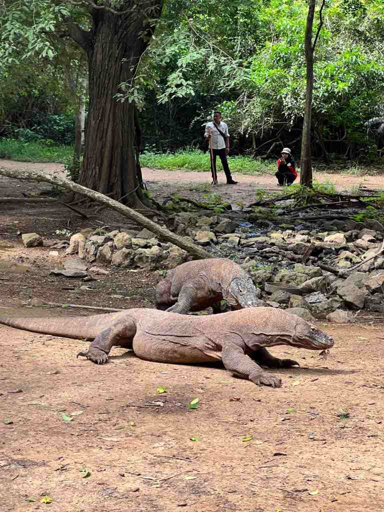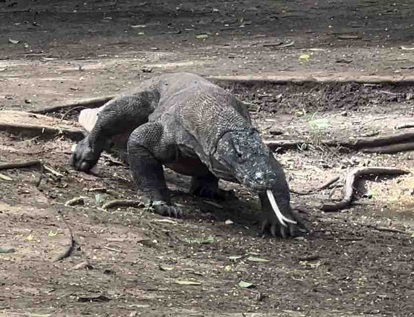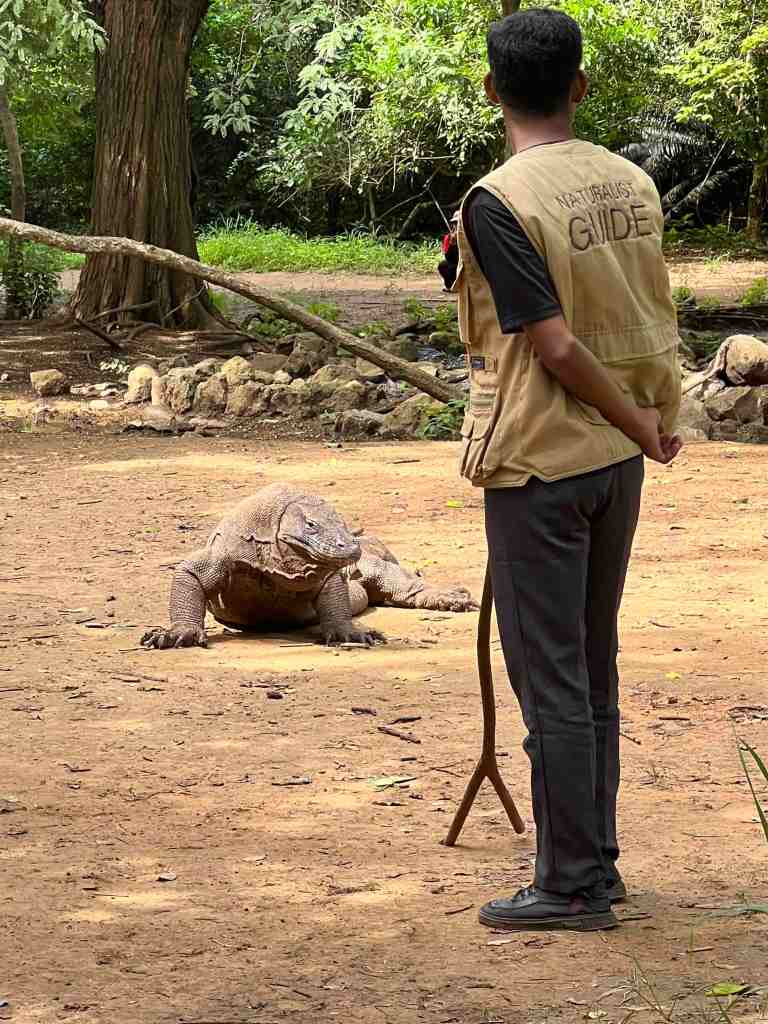 The island is a National Park.Β The Komodo dragon has plenty to eat since they stock the island with Timor deer, wild boar and some water buffalo.Β The park is a UNESCO World Heritage site.Β The entrance to Komodo National Park has no fences, no visitor center and no working bathroom facilities.Β There are covered platforms where guides and guards wait for their groups of tourists.Β Each guard carries a long, sturdy pronged stick to ward off any potential attack by a dragon.Β I was thinking something more substantial than a stick (you know what I’m saying). Each group of 20 tourists, get a guide and 2 guards for protection (one in front and one in back).