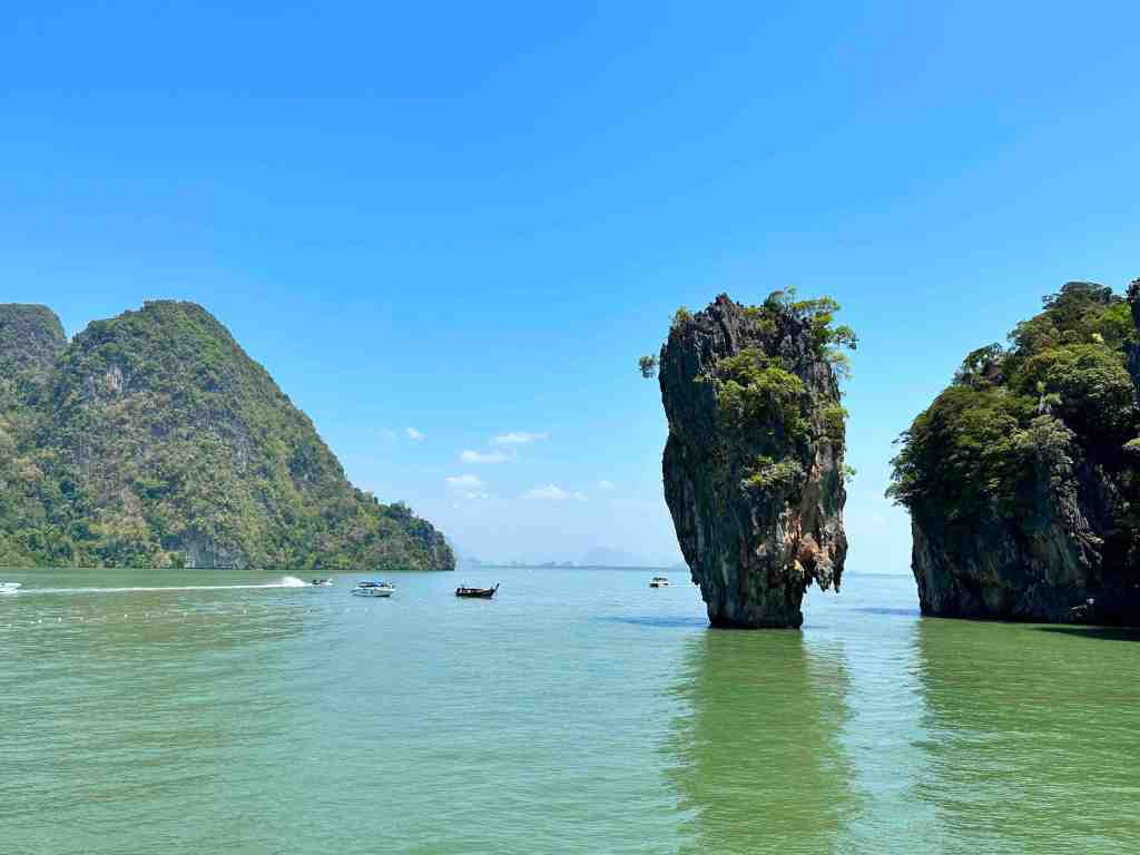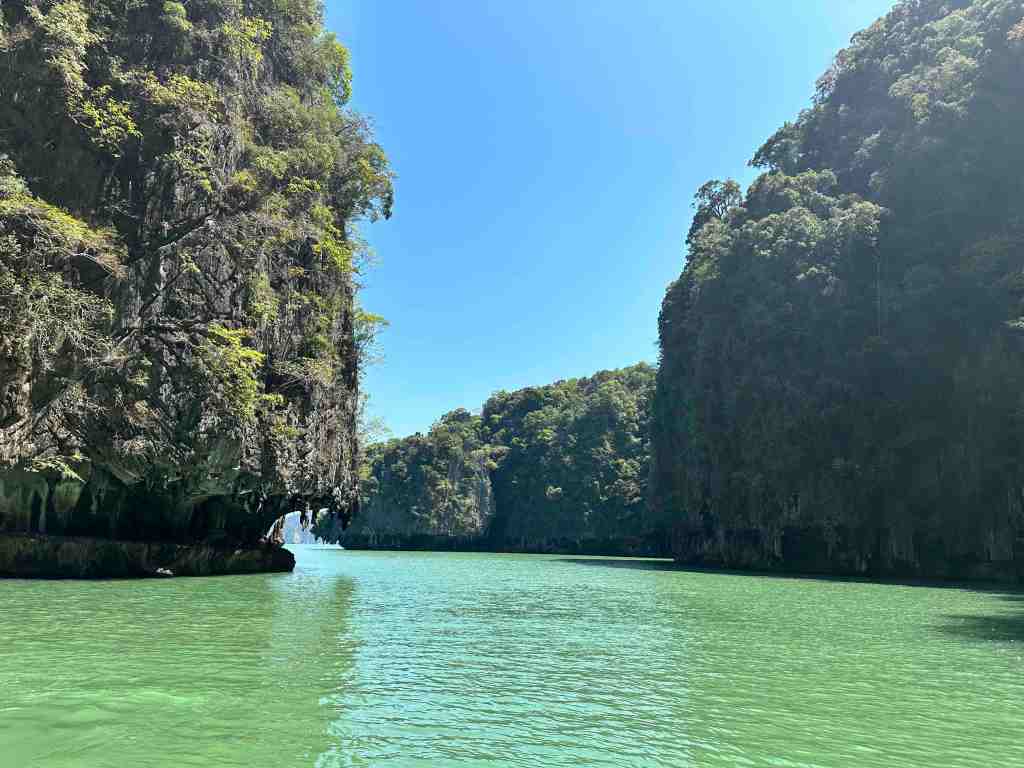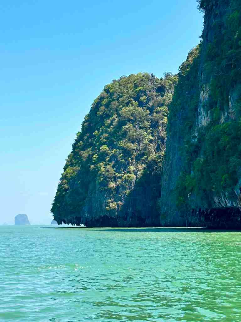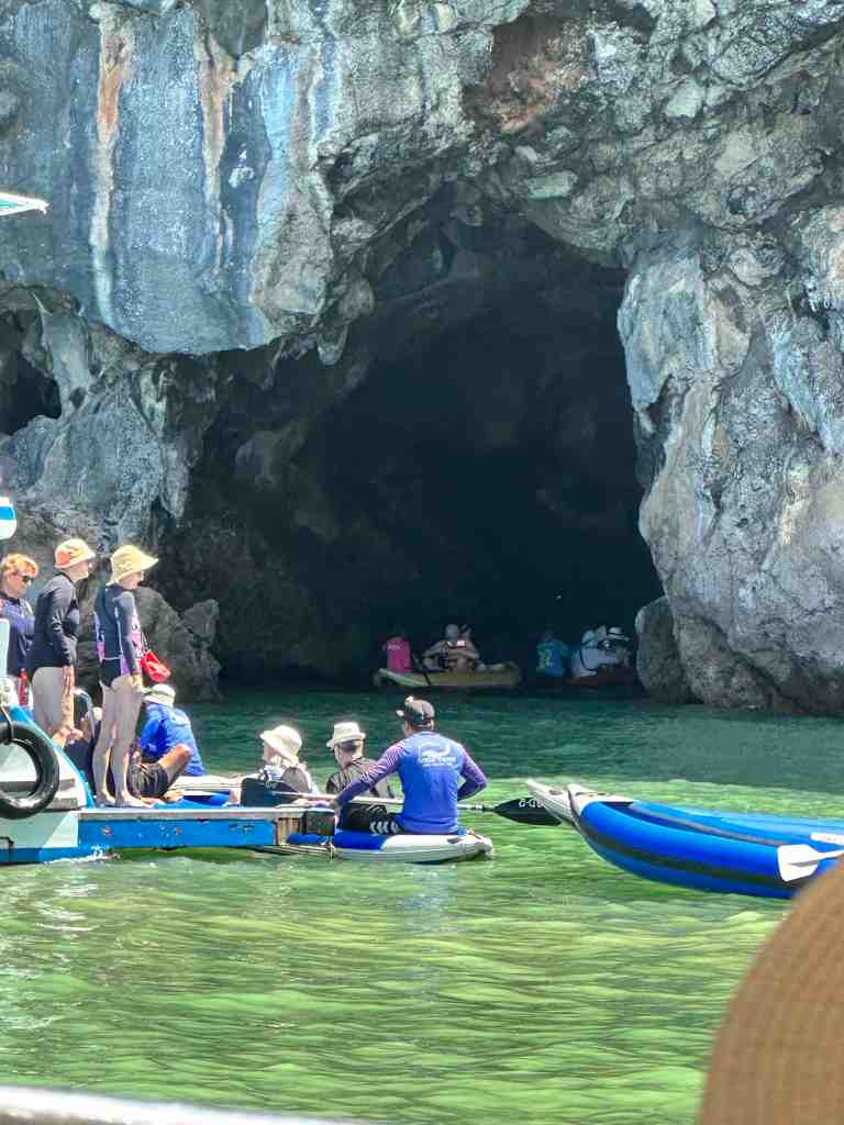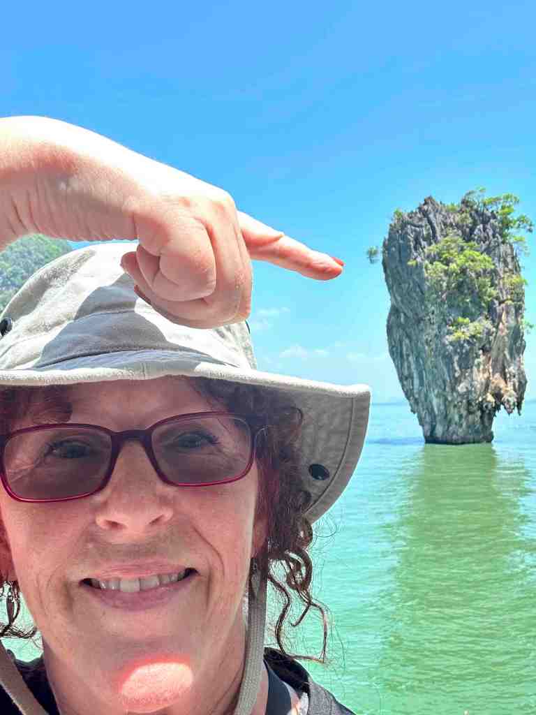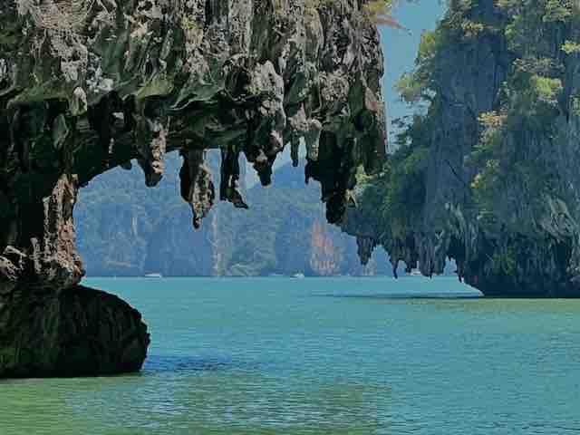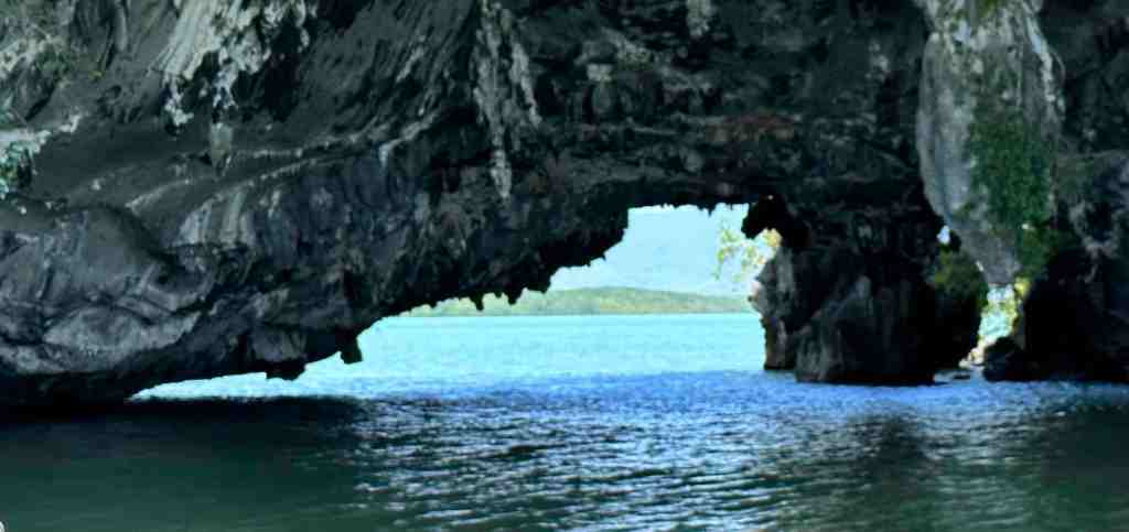 We reached the marina, boarded the high speed boat, put on our life jackets and off we went. Phang Nga Bay National Park is also know as James Bond Islands. If you’ve ever seen the movie, The Man With The Golden Gun, you’ll know what I’m talking about. The boat ride was fun. We bounced up and down as we flew out across the water. It took about 40 minutes and then you started seeing the normal looking islands turn into strange shapes and sizes. Hundreds of limestone cliffs rising out of the sea with amazing caves and natural sculptures. During low tide, they offer kayaking into some of the caves. Looked like great fun. When we arrived at the James Bond Island where they filmed part of the movie, the boat pulled onto a small beach and we were able to get out and go explore. Wow, it was really beautiful!