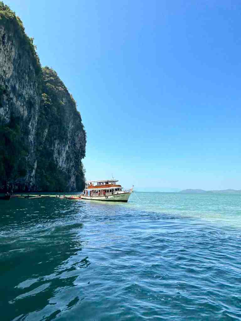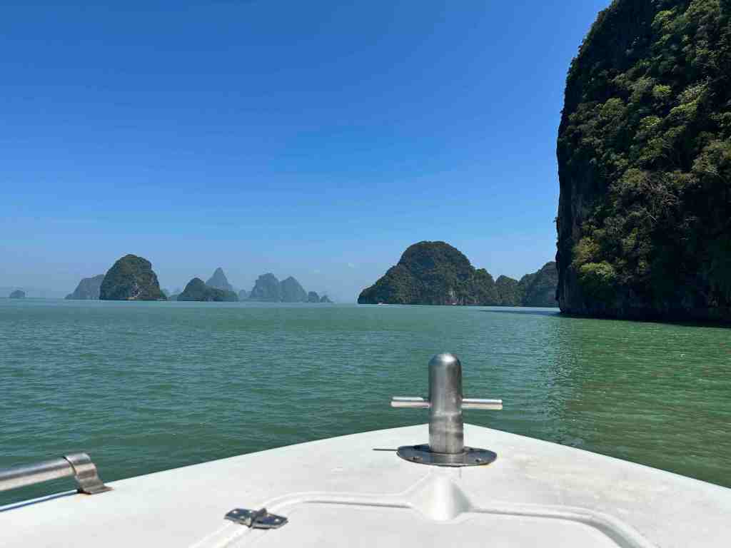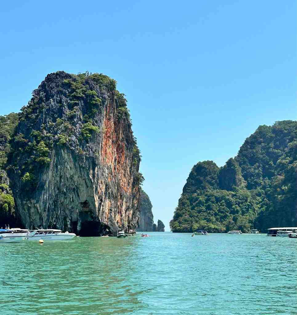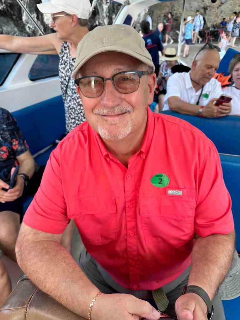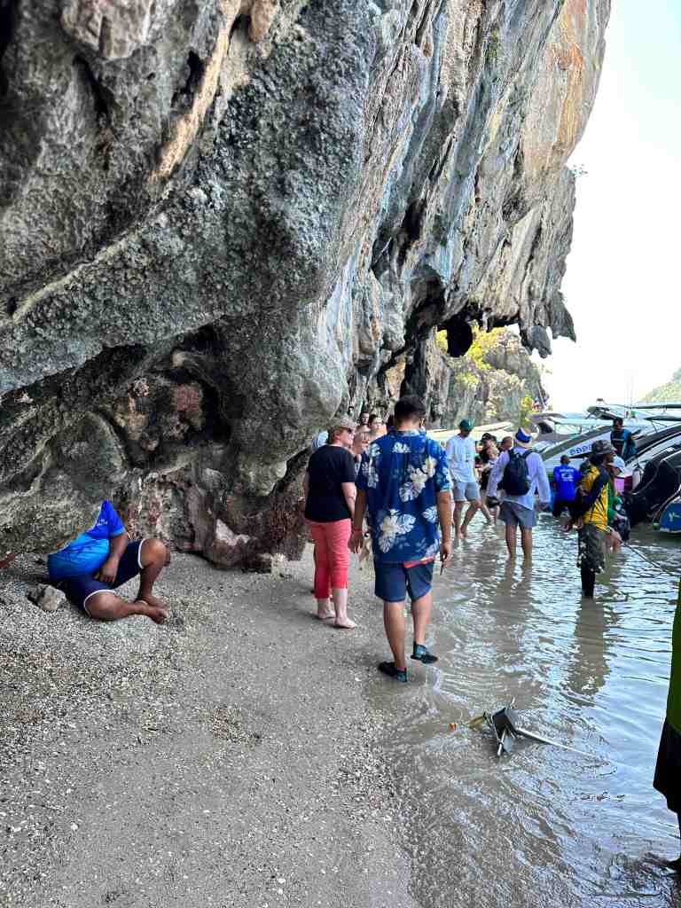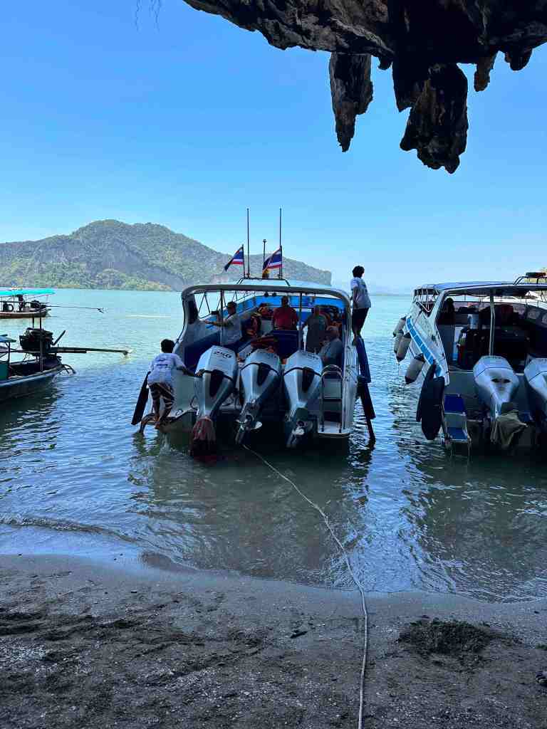 Bob and I are going on a speed boat today to Phang Nga Bay National Park. First, we took a bus through an area of Phuket to the marina to meet the boat. As we rode, we could see all the Thai people going to work or school. Most of them riding motor bikes with the whole family riding at once. It’s so strange to see a baby riding, sometimes in the front or squished between two people. We’ve seen 5 people on one. The other thing we recall, the wires on poles. You’ve never seen so many wires in your life. Complete chaos!