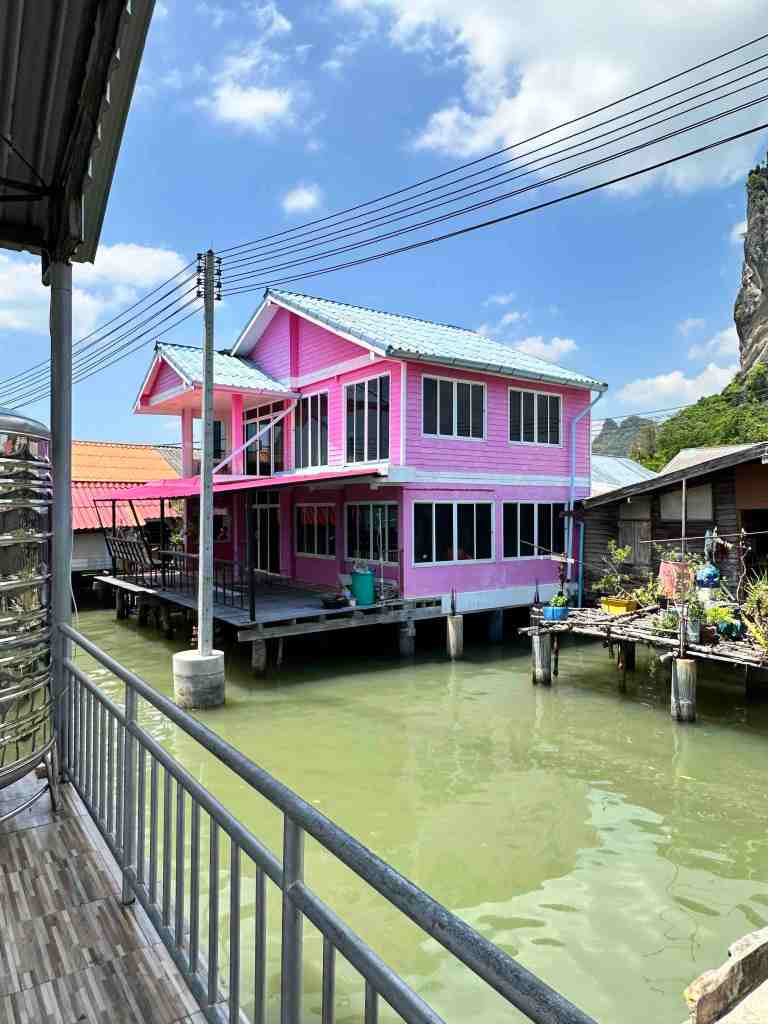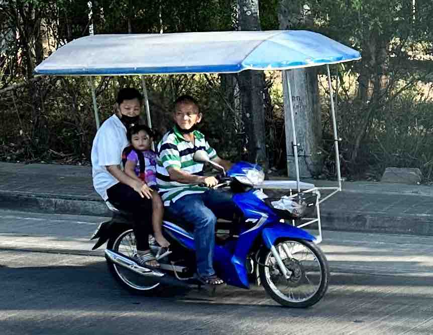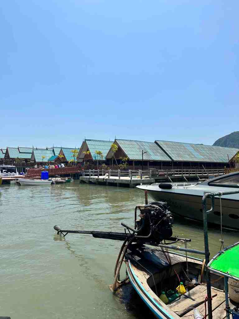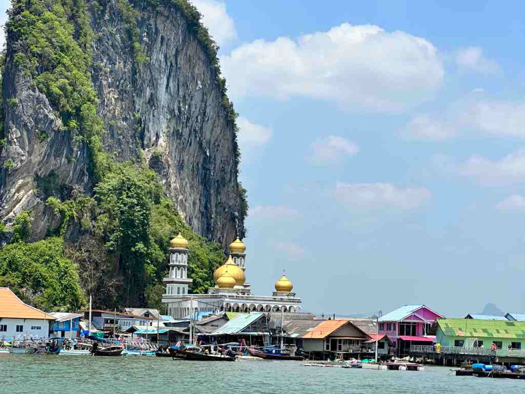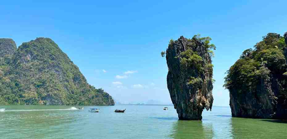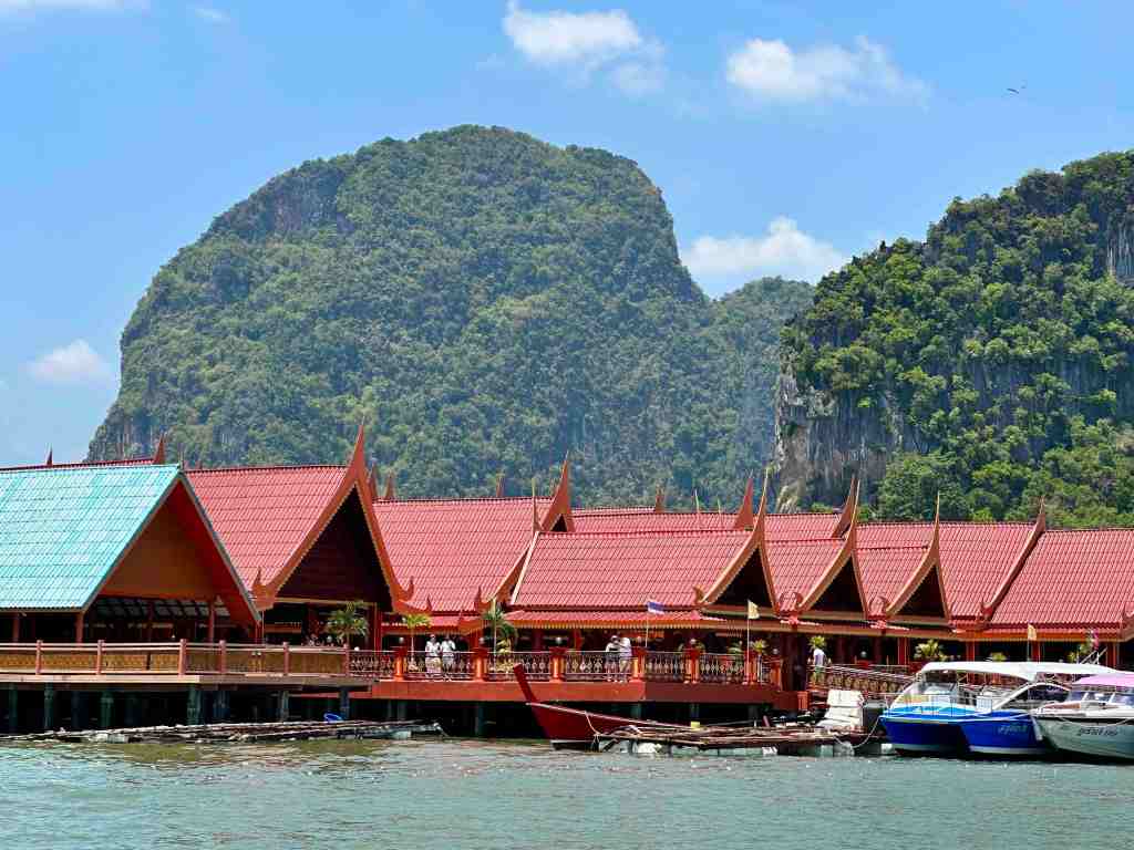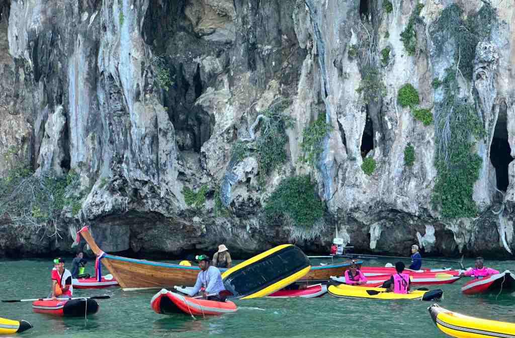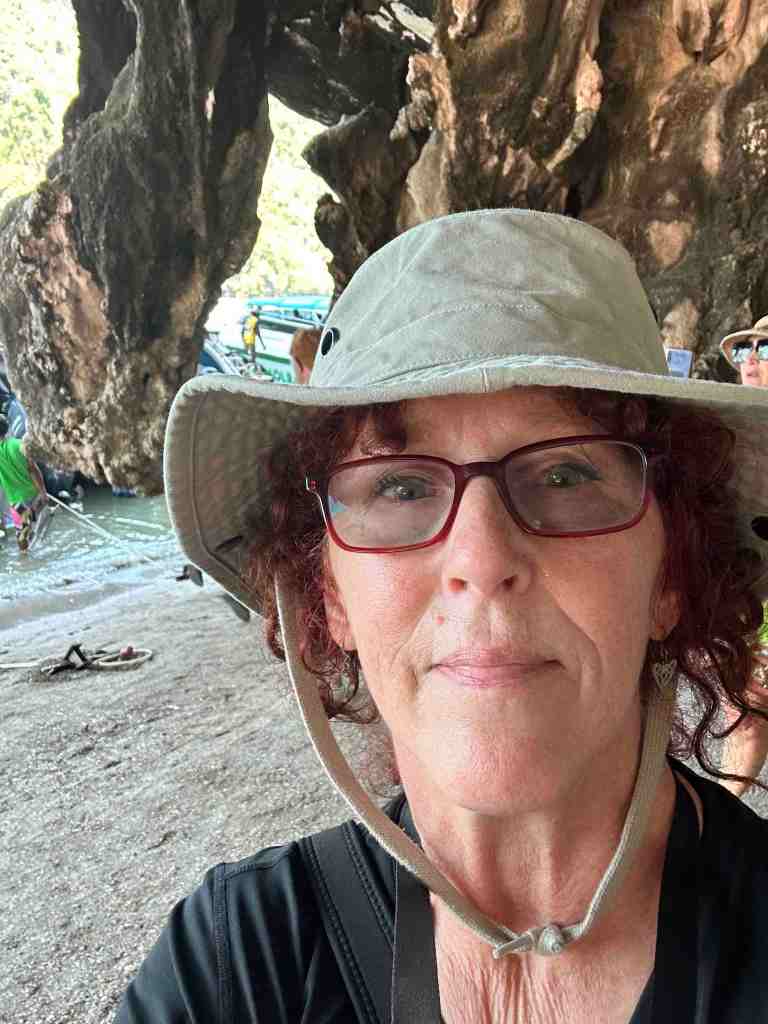 Bob and I are going on a speed boat today to Phang Nga Bay National Park. First, we took a bus through an area of Phuket to the marina to meet the boat. As we rode, we could see all the Thai people going to work or school. Most of them riding motor bikes with the whole family riding at once. It’s so strange to see a baby riding, sometimes in the front or squished between two people. We’ve seen 5 people on one. The other thing we recall, the wires on poles. You’ve never seen so many wires in your life. Complete chaos!