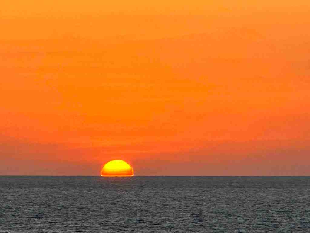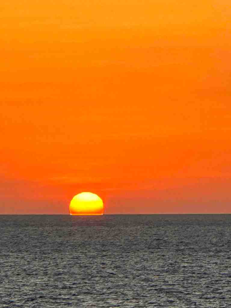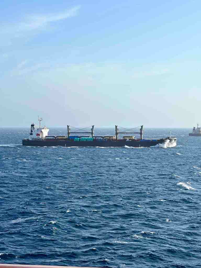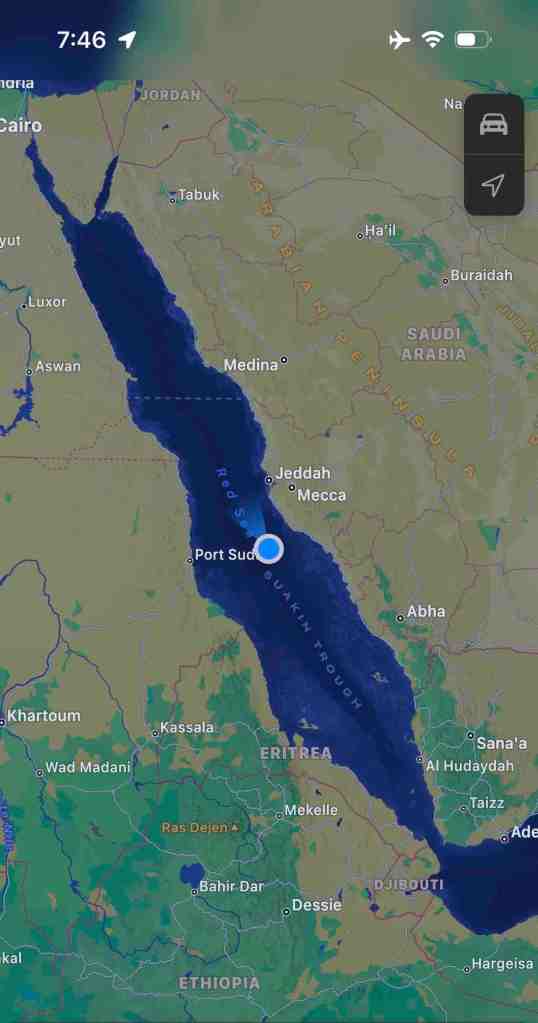 Wednesday, March 22 – we’re in the middle of Red Sea. The size surprised me. We’re sailing straight up the middle so you can’t see land on either side. We can see a military ship shadowing us from behind, origin unknown (guessing Saudi). It seems as huge as an ocean. It’s one of the heaviest traveled waterways in the world. It splits Africa from Asia. Saudi Arabia to the east and Ethiopia to the west. We had a beautiful sunset tonight.
