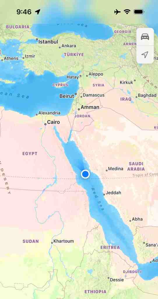 Thursday, March 23 – Red Sea with Egypt to our west and Saudi Arabia to east. We’re seeing many ships coming and going. We entered the east finger of the Red Sea (Gulf of Aqaba) around sunset this evening. Arriving in Aqaba early morning on Friday.