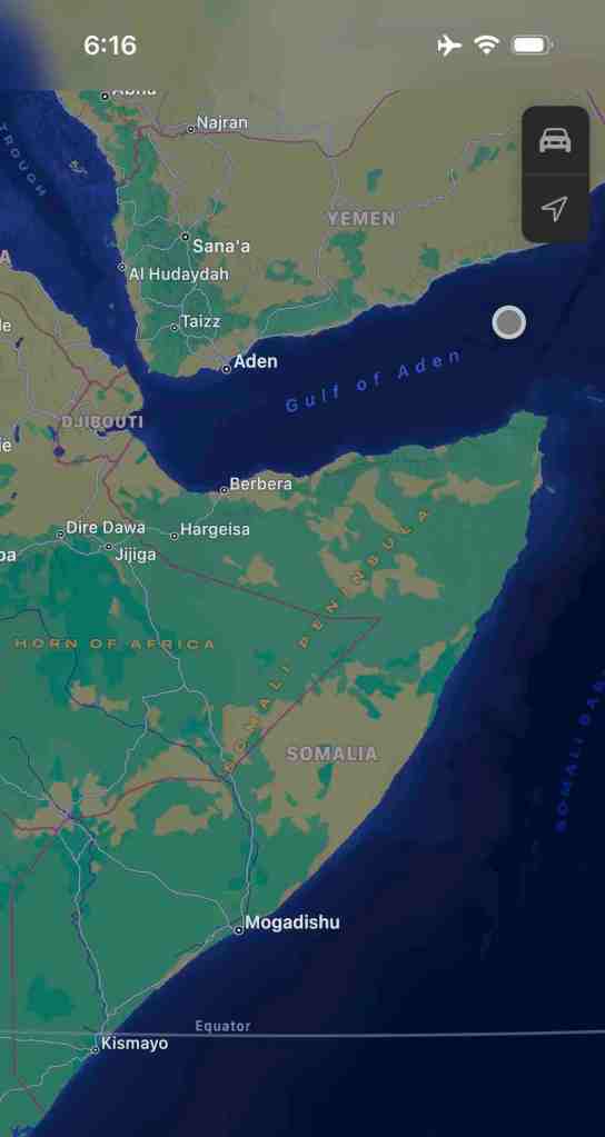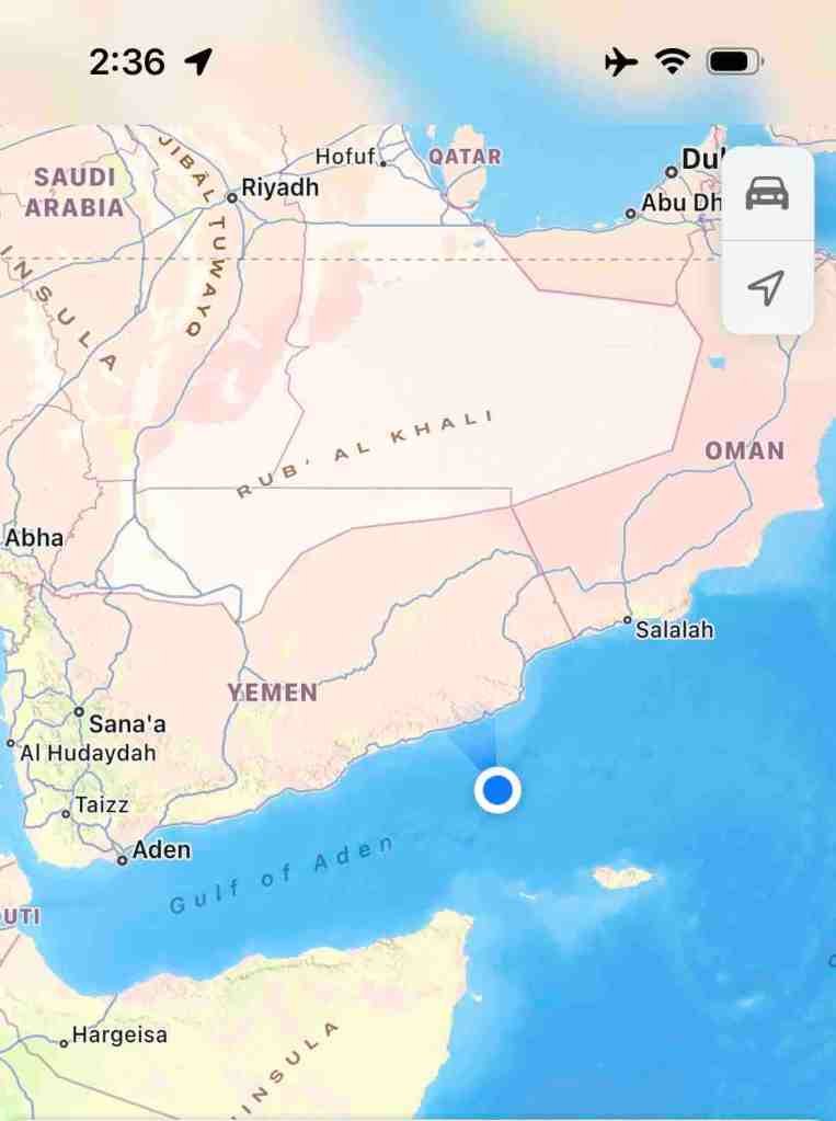 We were in the Gulf Of Aden Monday, March 20. Yemen north of us and Somalia to south. Officers on deck at all time watching with binoculars for pirates. Veteran’s group on board also volunteered for pirate watch.