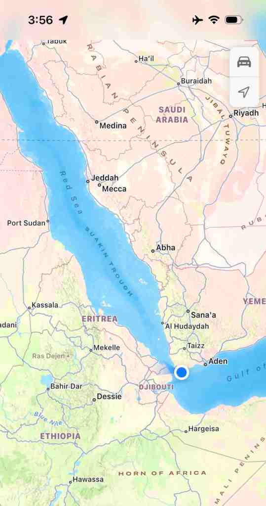 We officially entered the Red Sea Tuesday evening March 21. Past Djibouti and through a narrow area after dark.