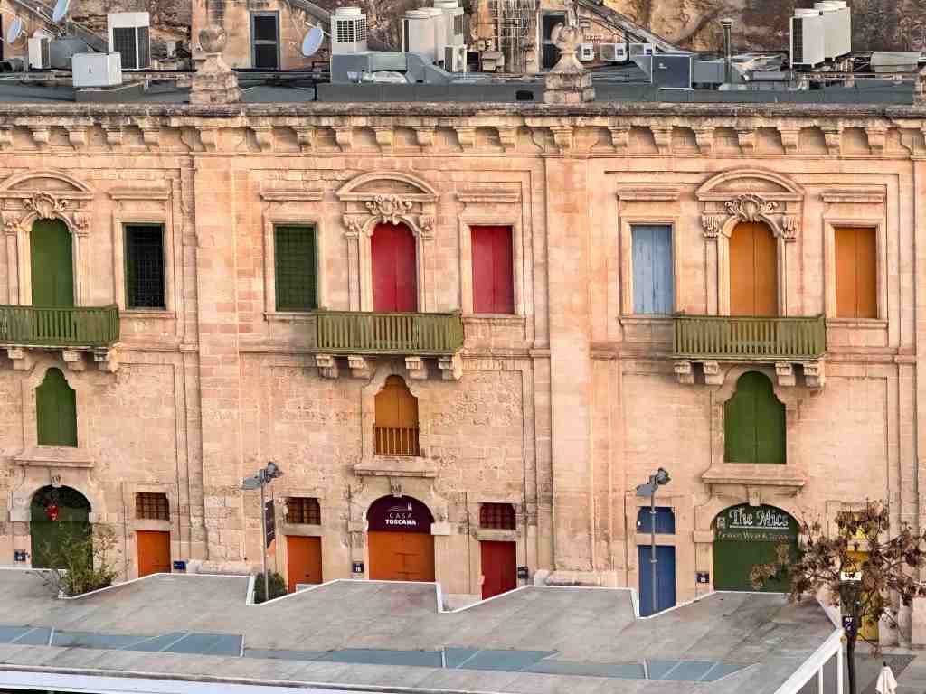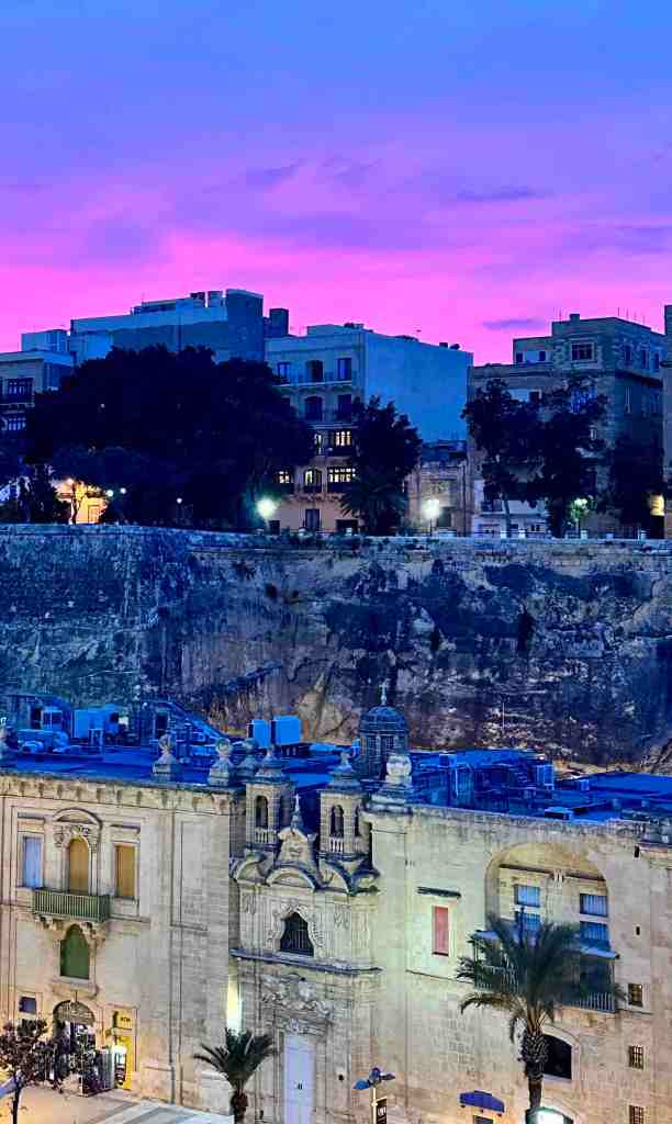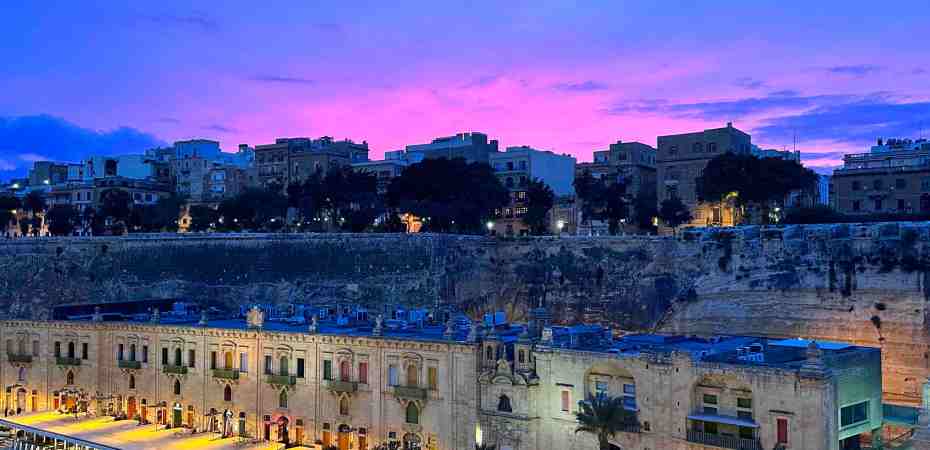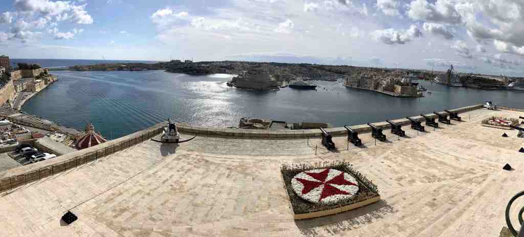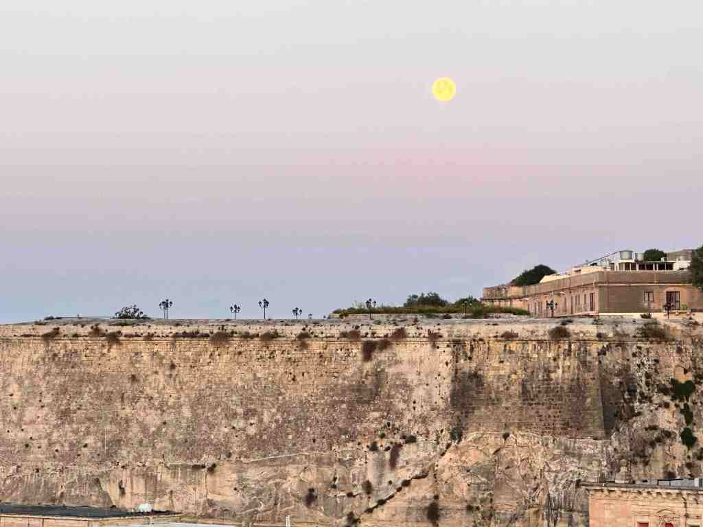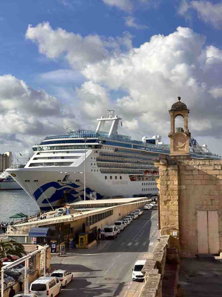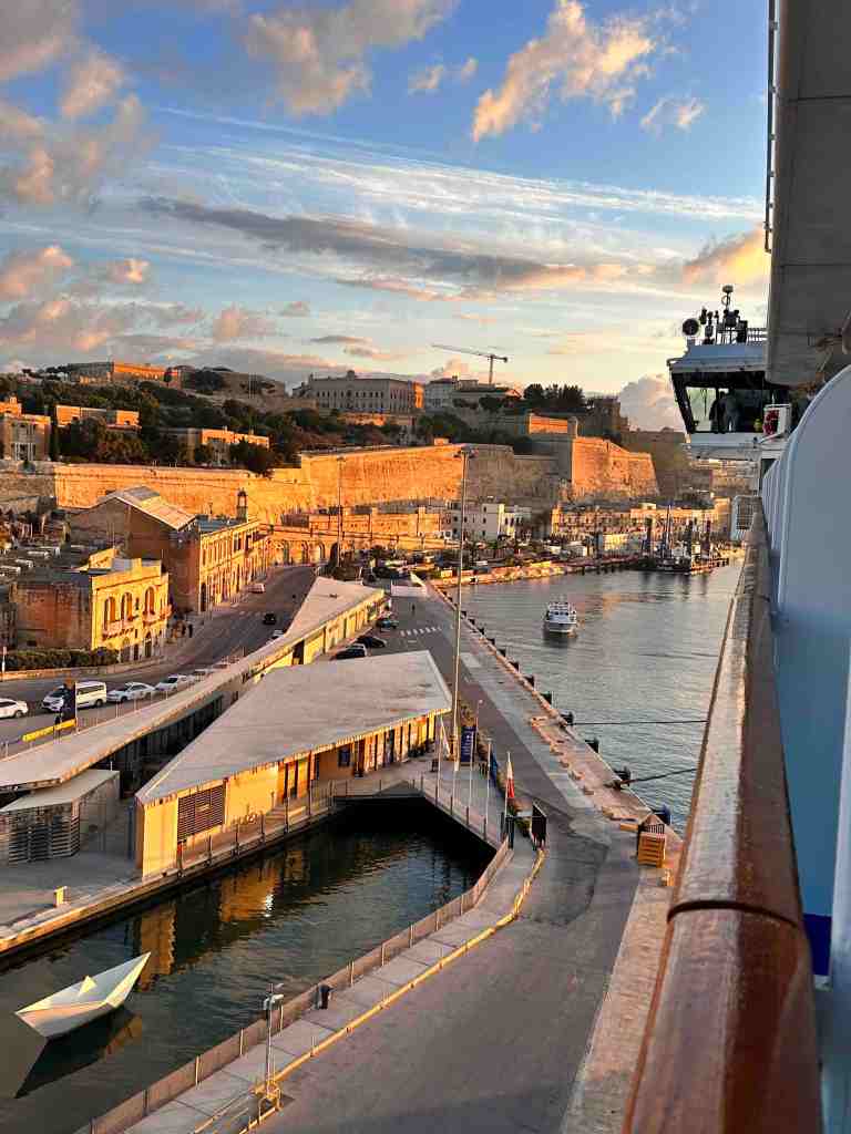 I opened the curtains at 6 am. Breathtaking! What is this magical place? We are docked right in the old city of Valletta, Malta. The full moon is sparkling on the water with the old city as the background. Valletta, the smallest capital of the European Union, is a UNESCO World Heritage Site.
