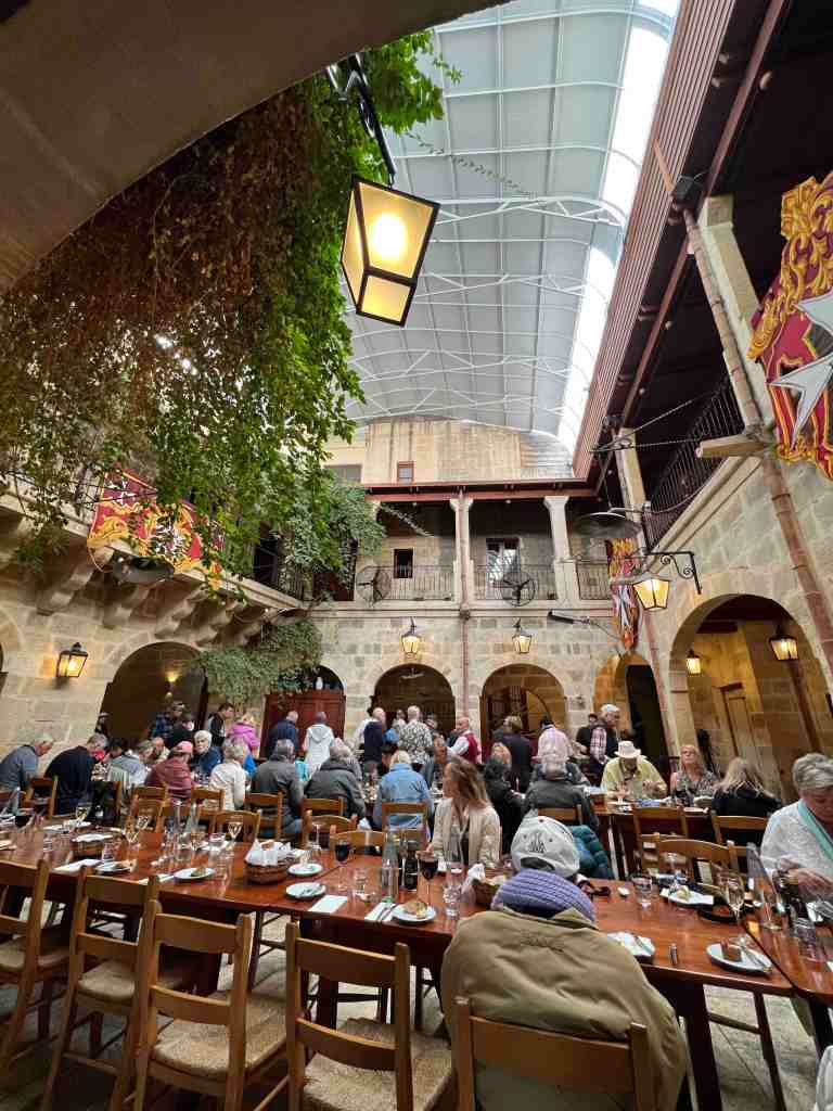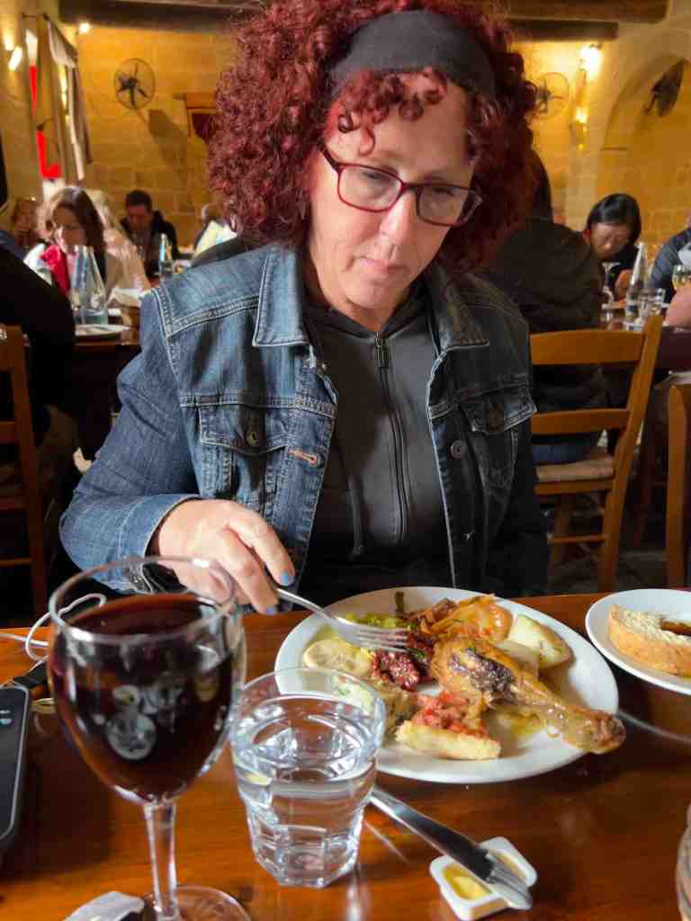 Next we took a bus ride across town to what they described as an old farm house for lunch. This farm house was very large with a formal courtyard. They had set up a buffet lunch for several tours from our ship. Many Mediterranean dishes with lots of good vegetables, variety of salads, breads, olive oils, pastas and wine.
