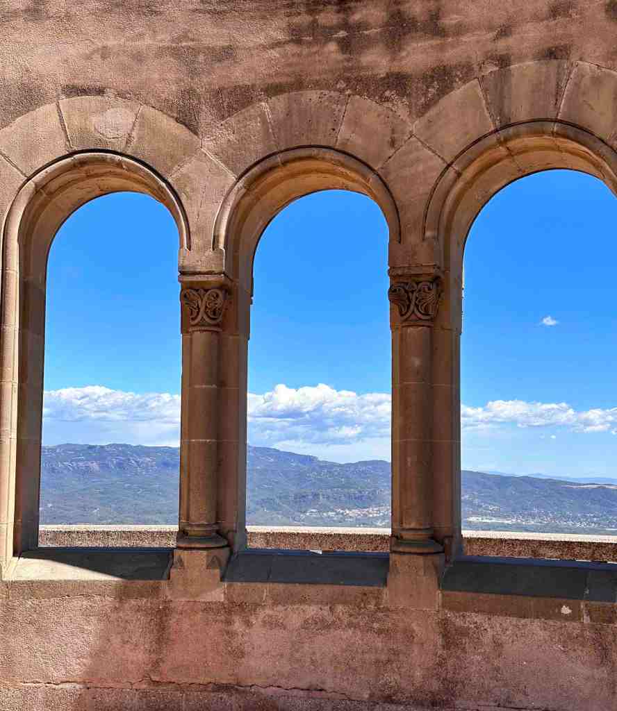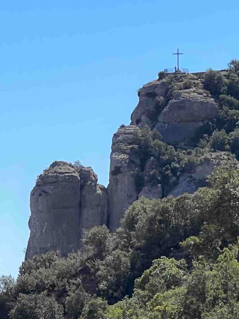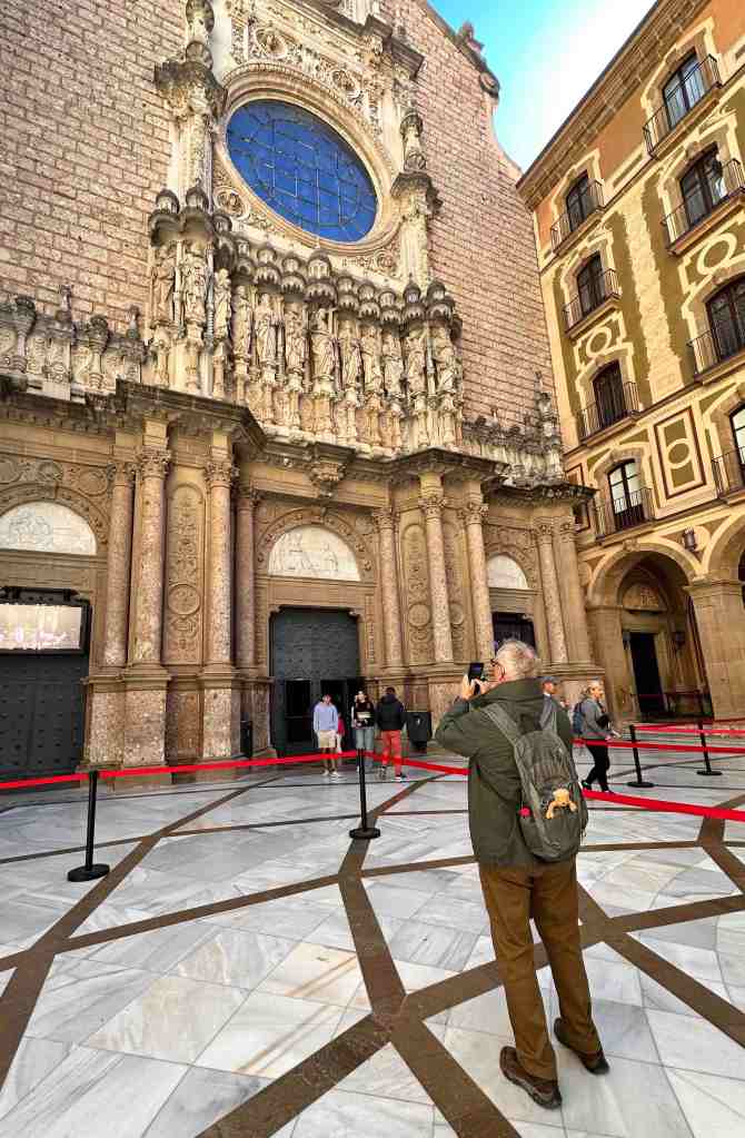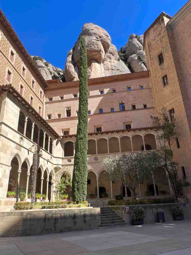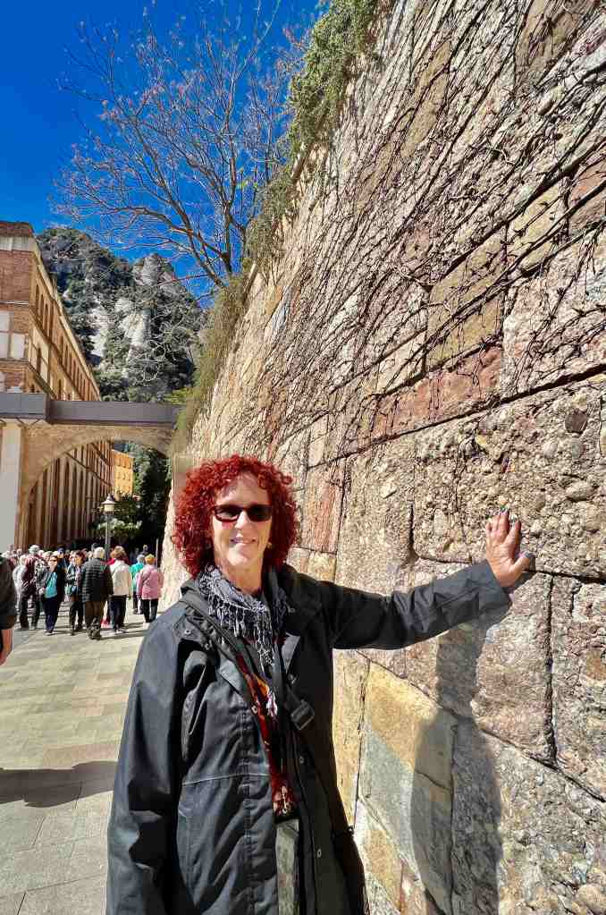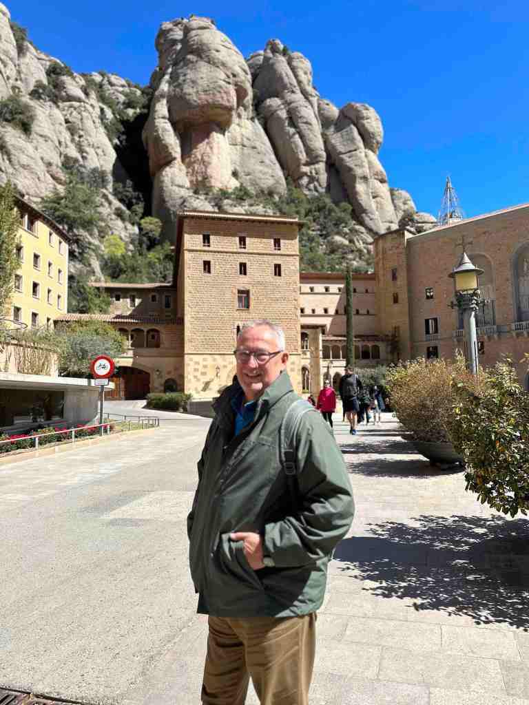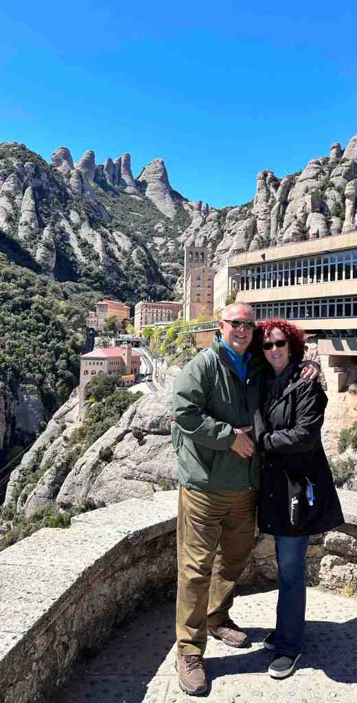 We booked a tour this morning to the famous monastery of Santa Maria de Montserrat (a Benedictine monastery located in the Catalonia region of Spain).  We took a bus from the port into Barcelona.  I remember walking from the port into Barcelona last time we were here.  We saw the Olympic Rings from 1992 Summer Games and not far from that, a very tall monument (almost 200’ column) with a 23’ statue of Christopher Columbus at the very top.  He seemed to almost be in the clouds.  The monument was built for the World’s Fair (1888) in Barcelona.  The monument recalls that it was Barcelona that Columbus reported to Queen Isabel and King Ferdinand after his most famous voyage and is said to be pointing to the New World (do you recall as kids the teacher would say ‘In 1492, Columbus sailed the ocean blue’).
