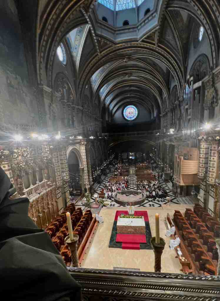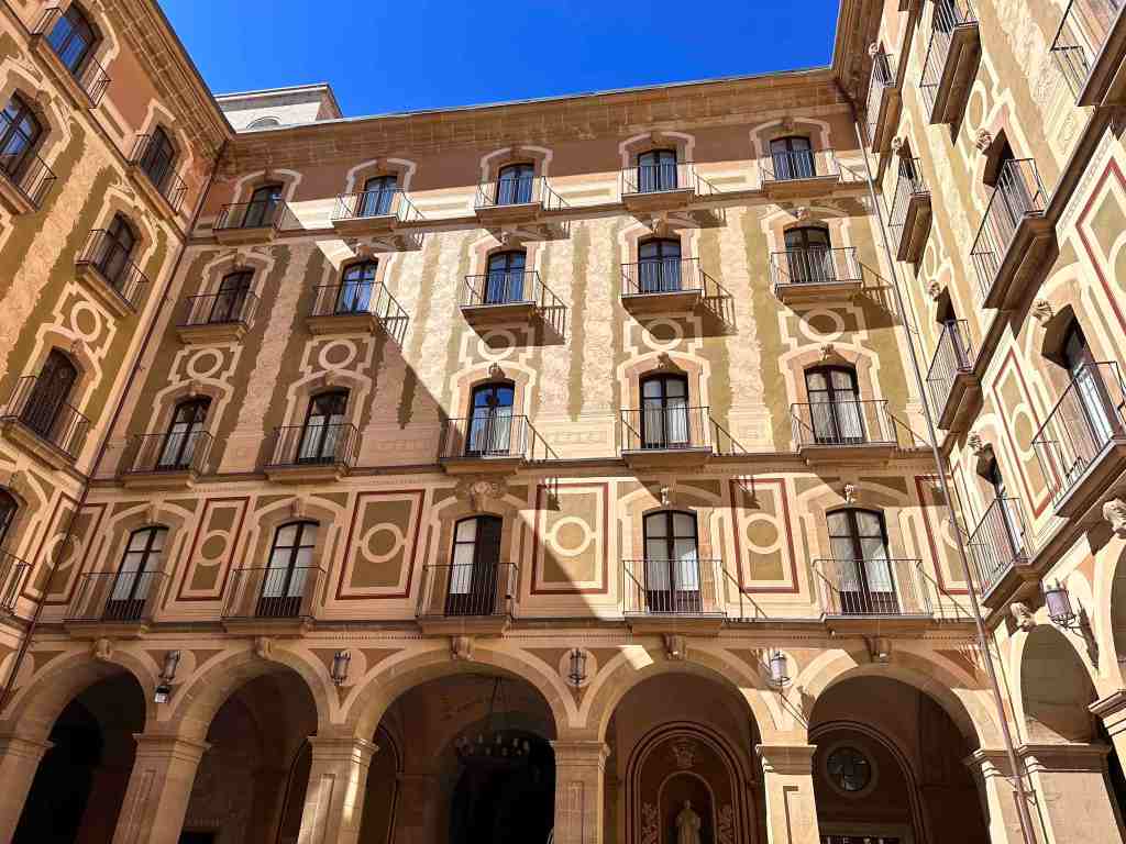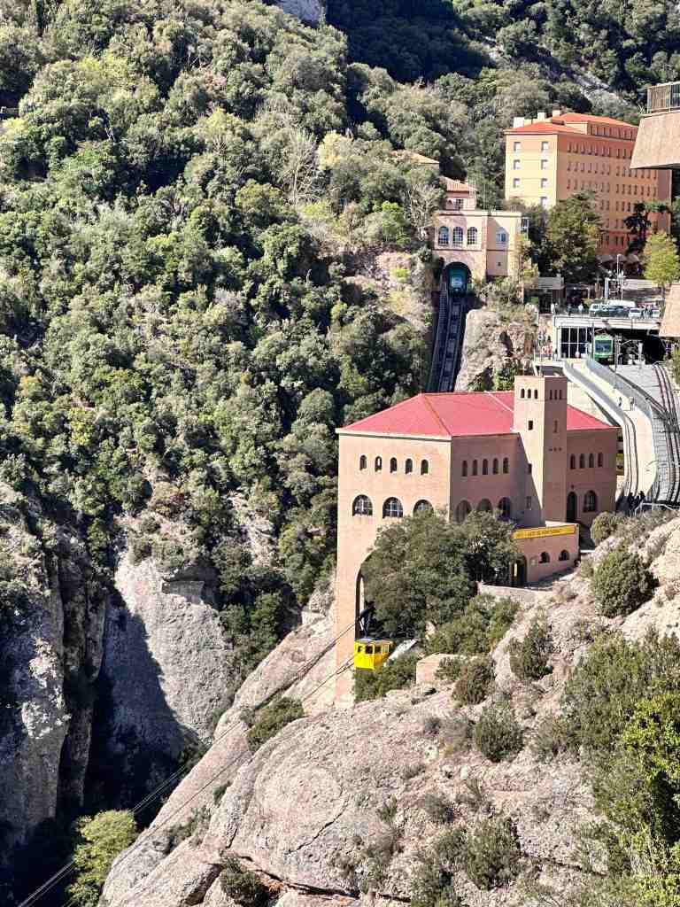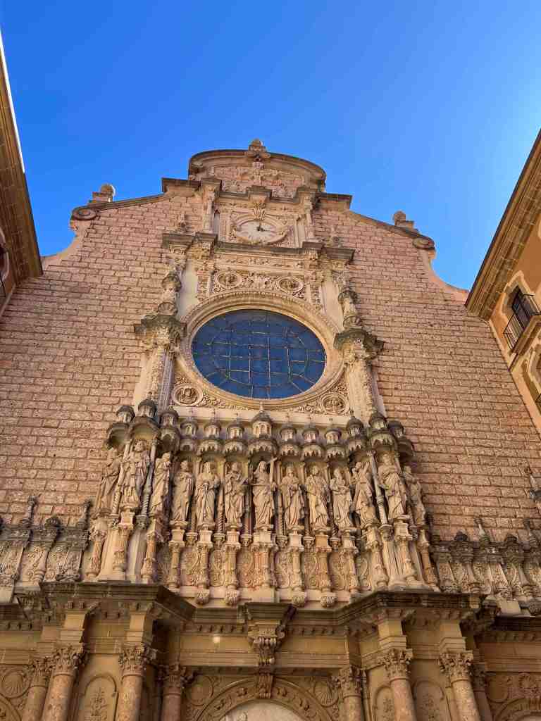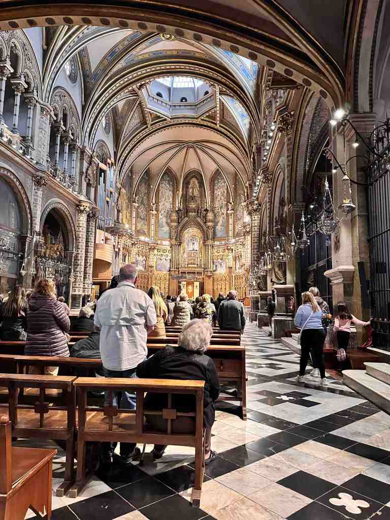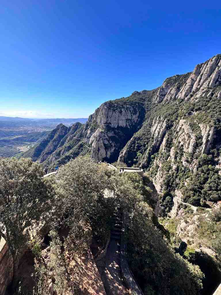 We booked a tour this morning to the famous monastery of Santa Maria de Montserrat (a Benedictine monastery located in the Catalonia region of Spain).  We took a bus from the port into Barcelona.  I remember walking from the port into Barcelona last time we were here.  We saw the Olympic Rings from 1992 Summer Games and not far from that, a very tall monument (almost 200’ column) with a 23’ statue of Christopher Columbus at the very top.  He seemed to almost be in the clouds.  The monument was built for the World’s Fair (1888) in Barcelona.  The monument recalls that it was Barcelona that Columbus reported to Queen Isabel and King Ferdinand after his most famous voyage and is said to be pointing to the New World (do you recall as kids the teacher would say ‘In 1492, Columbus sailed the ocean blue’).