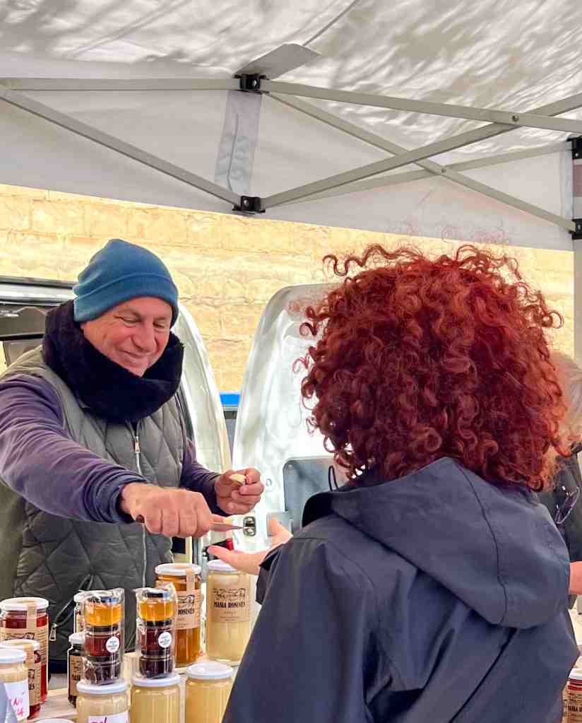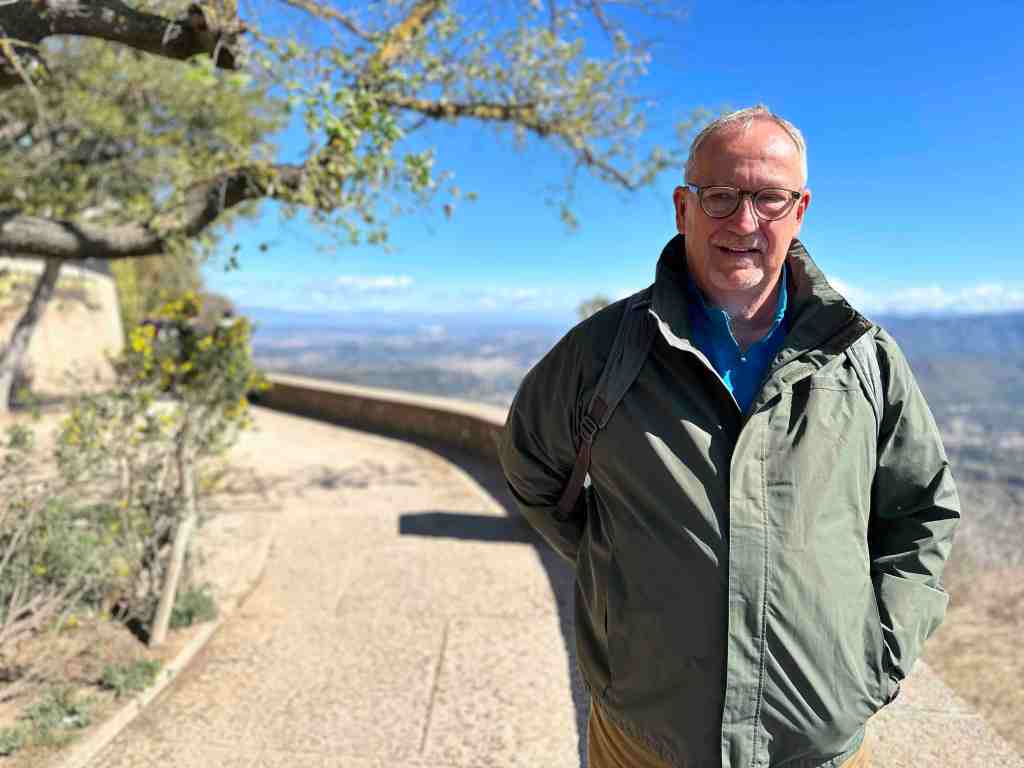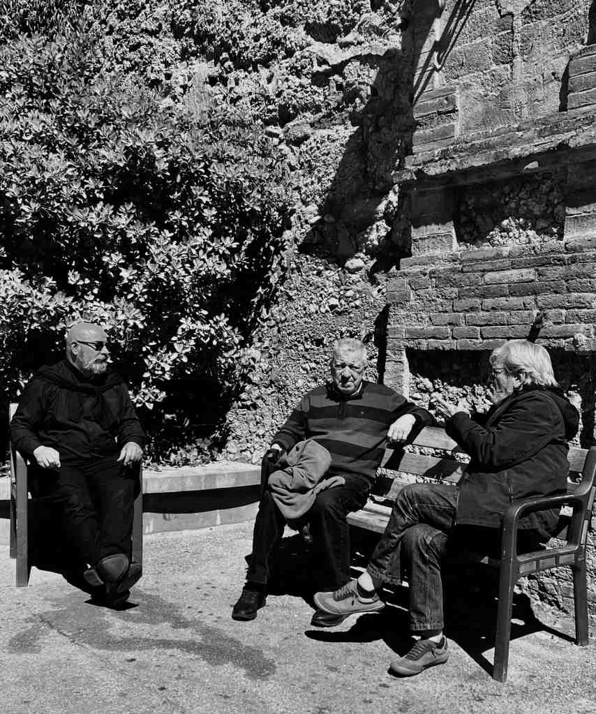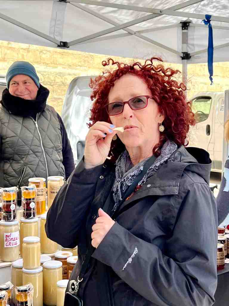 After exploring the complex, we walked a short distance and visited some vendors selling honey and cheeses.  We’ve sampled some cheeses throughout our trip and seems each one is a bit different than the next but I will say, all delicious.  There is a kind I would like to find when we get home that we heard about in France (French Alpine Cheeses).  There are many kinds of Alpine cheese but specifically, Beaufort cheese.  There are places in France where their dairy cows are lead high into the Alpine mountains in the summer where they graze on wild flowers and herbs that flourish briefly among the grasses where the cows graze.  Most highly prized of all is ‘Beaufort Chalet d’ Alpage’, produced in often remote settings above 5,000 feet.  Ok, enough about France, we’re in Spain!  I got sidetracked because we were hungry.  We did not have breakfast this morning so we decided to go to a small restaurant and grab a quick snack to eat outside and enjoy the sun and breathtaking views before we had to leave.
