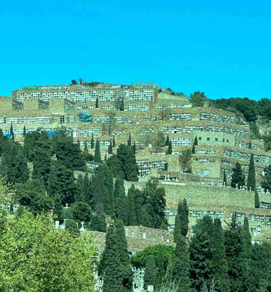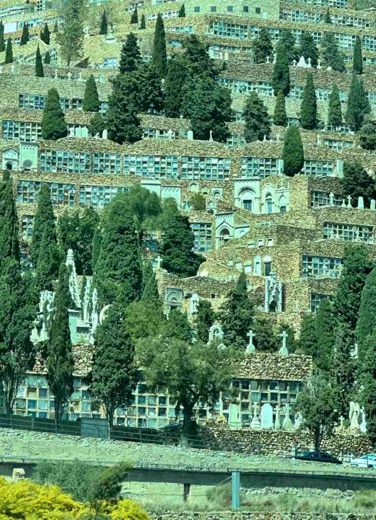 We arrived at the port in Barcelona at 7 am.  We docked in a commercial area where you could see port cranes loading and unloading shipping containers from big ships.  We could see something interesting on the other side of the port, but we were not sure what it was.  We got out the binoculars and realized it was an old cemetery that went straight up the steep hill.  Cementiri de Montjuic, the cemetery on the hill of Barcelona is a very special park.  This park of about 57 acres lies between the cargo port and the Castell.  The very morbid atmosphere has its own charm.  Here you can experience 150 years of art history.  The park is a unique place of silence in Barcelona.