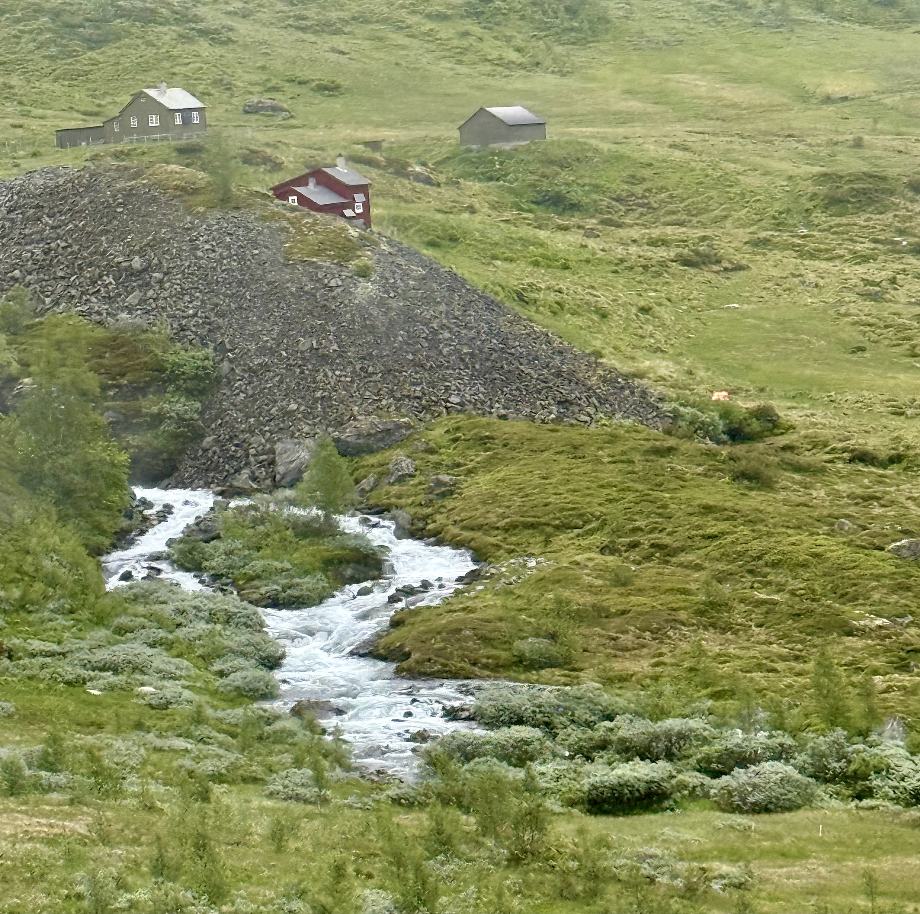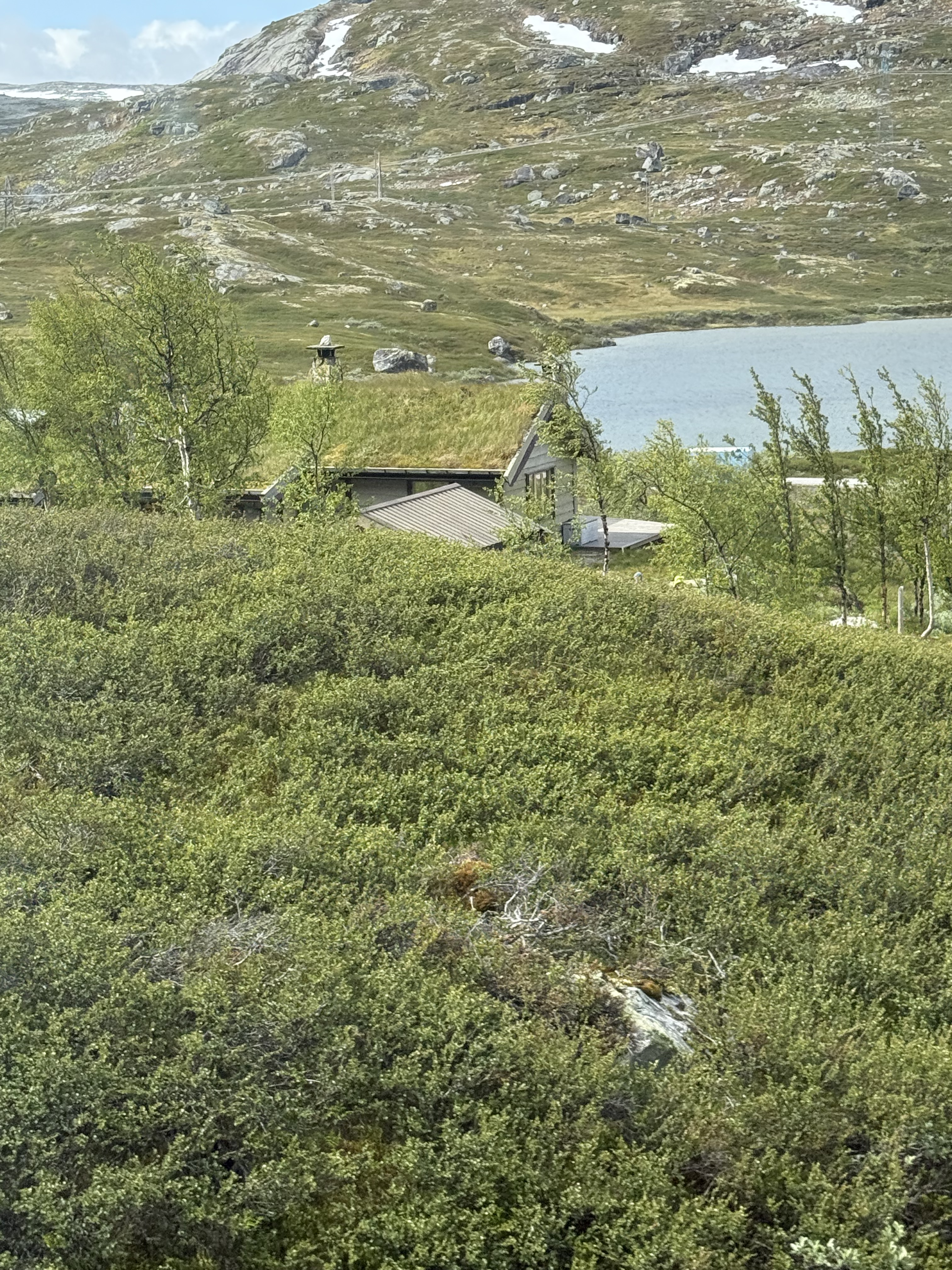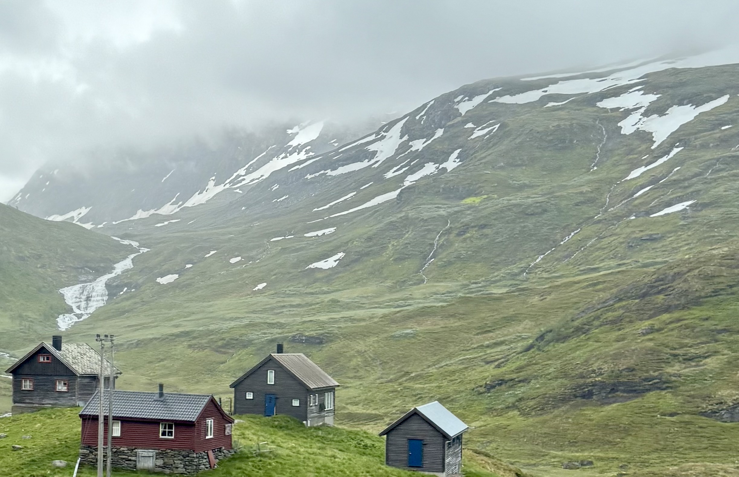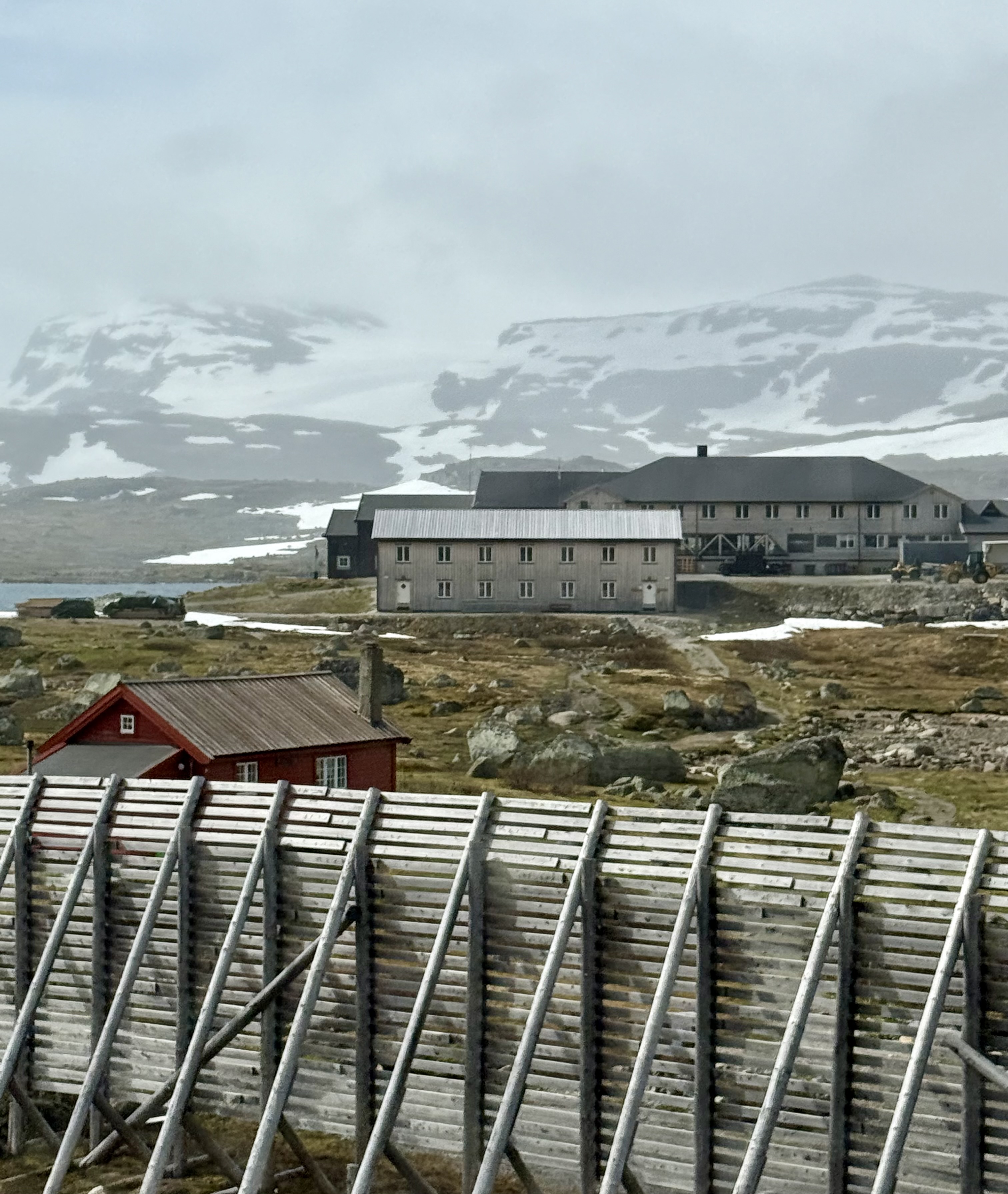 We recognized one of our stops because we were just there last week. Voss. We saw the hotel that the nazi’s occupied because the train station is right there. Voss is northeast of Bergen. Now we’re heading higher into the mountains were you see avalanche sheds and big steel fences to protect communities from landslides.