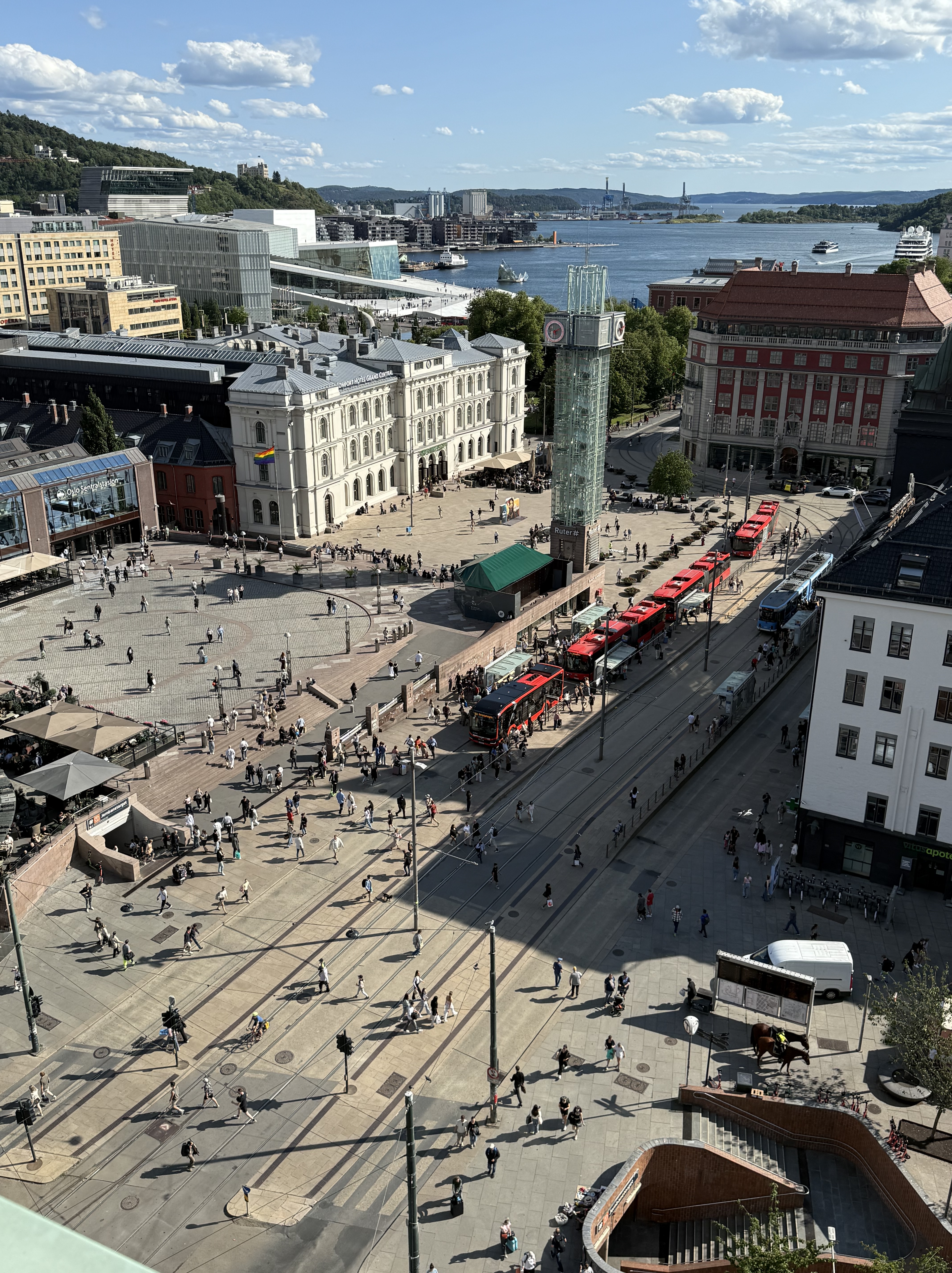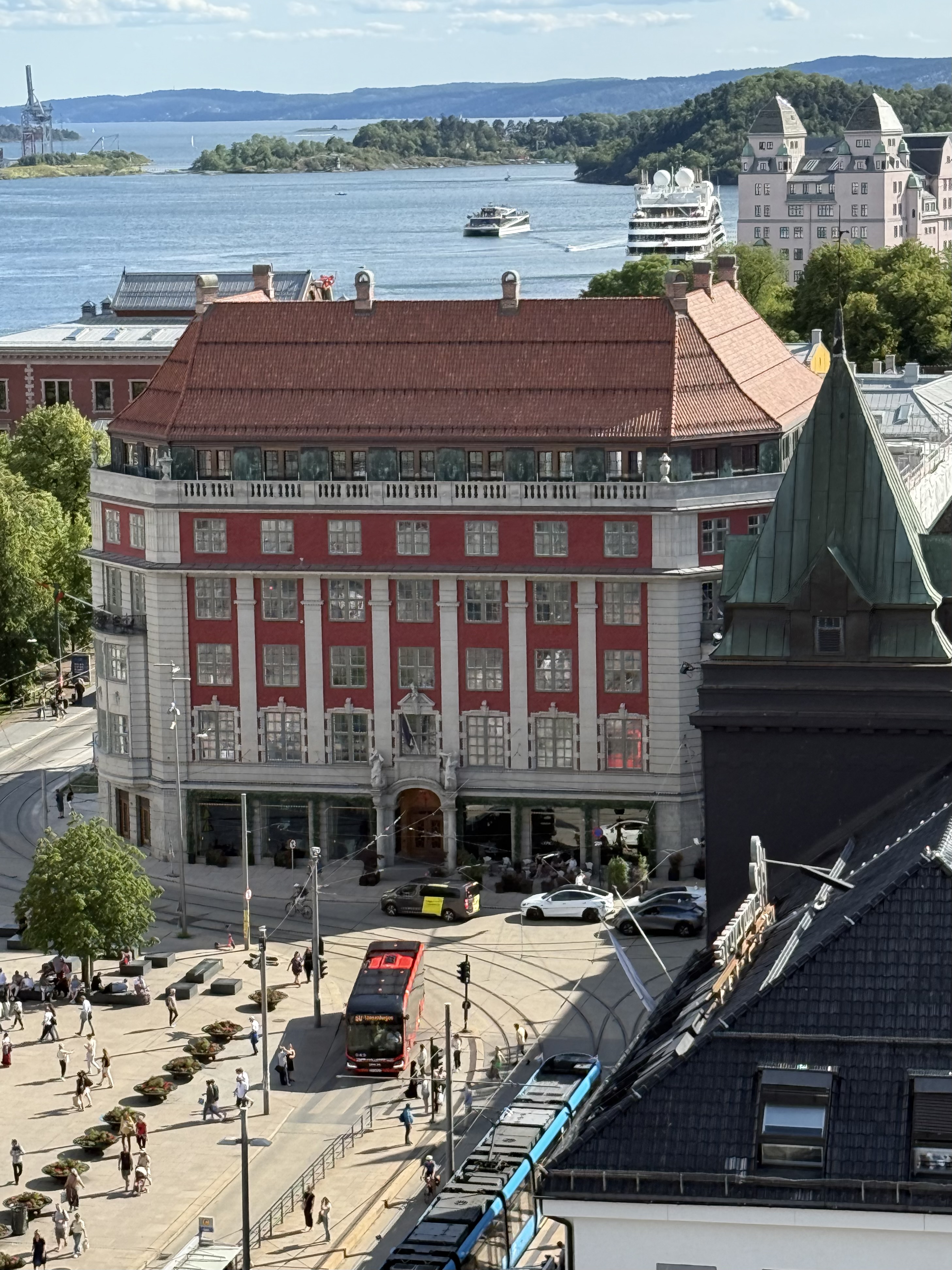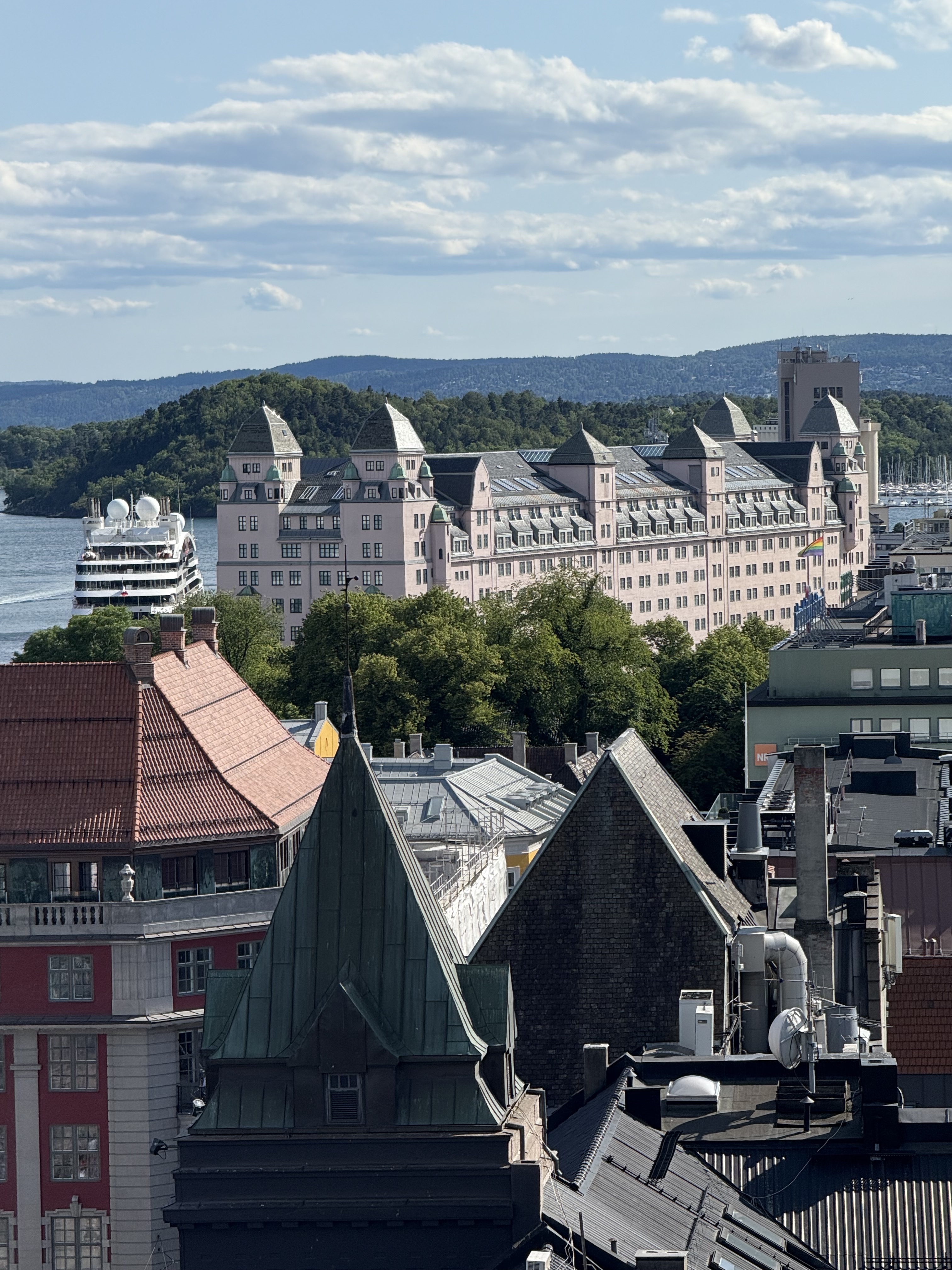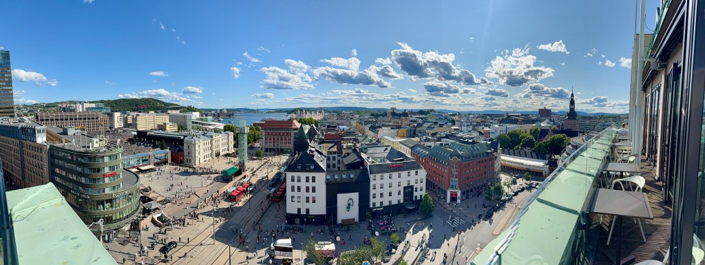 We have arrived in Oslo. It’s a sunny day with blue sky and temps in the mid 70’s. We arrived at the train station and walked across the street to our hotel (Clarion Hotel Oslo). What a great location. Checked into our room and decided to go to an early dinner since we did not have lunch. Our hotel had a restaurant on the top floor with a spectacular view of downtown Oslo. We had a delicious dinner and really enjoyed watching the motion of people, trains and trolley’s and we watched from our dinner table. As we looked out the window, we started planning where to walk this evening.