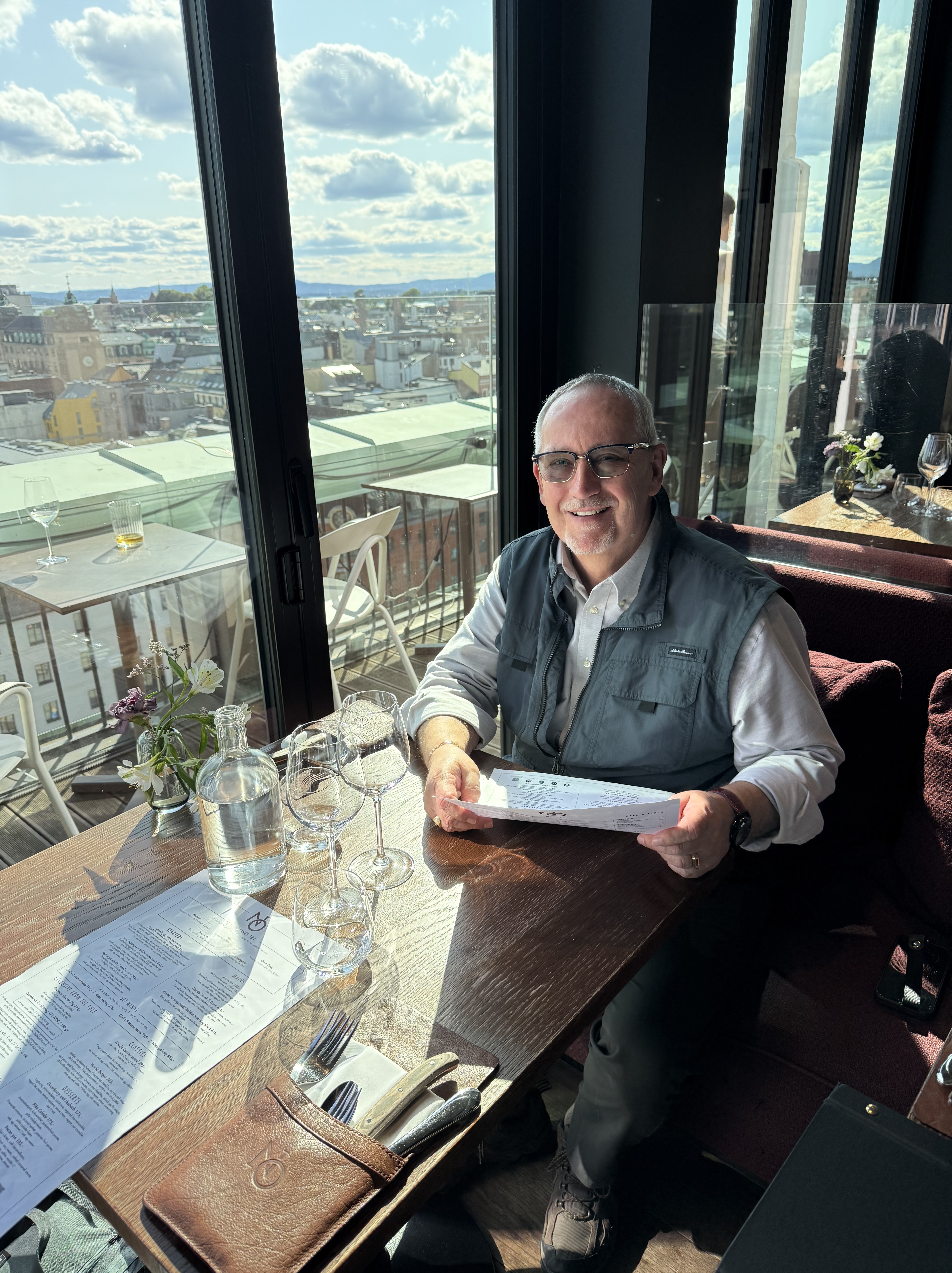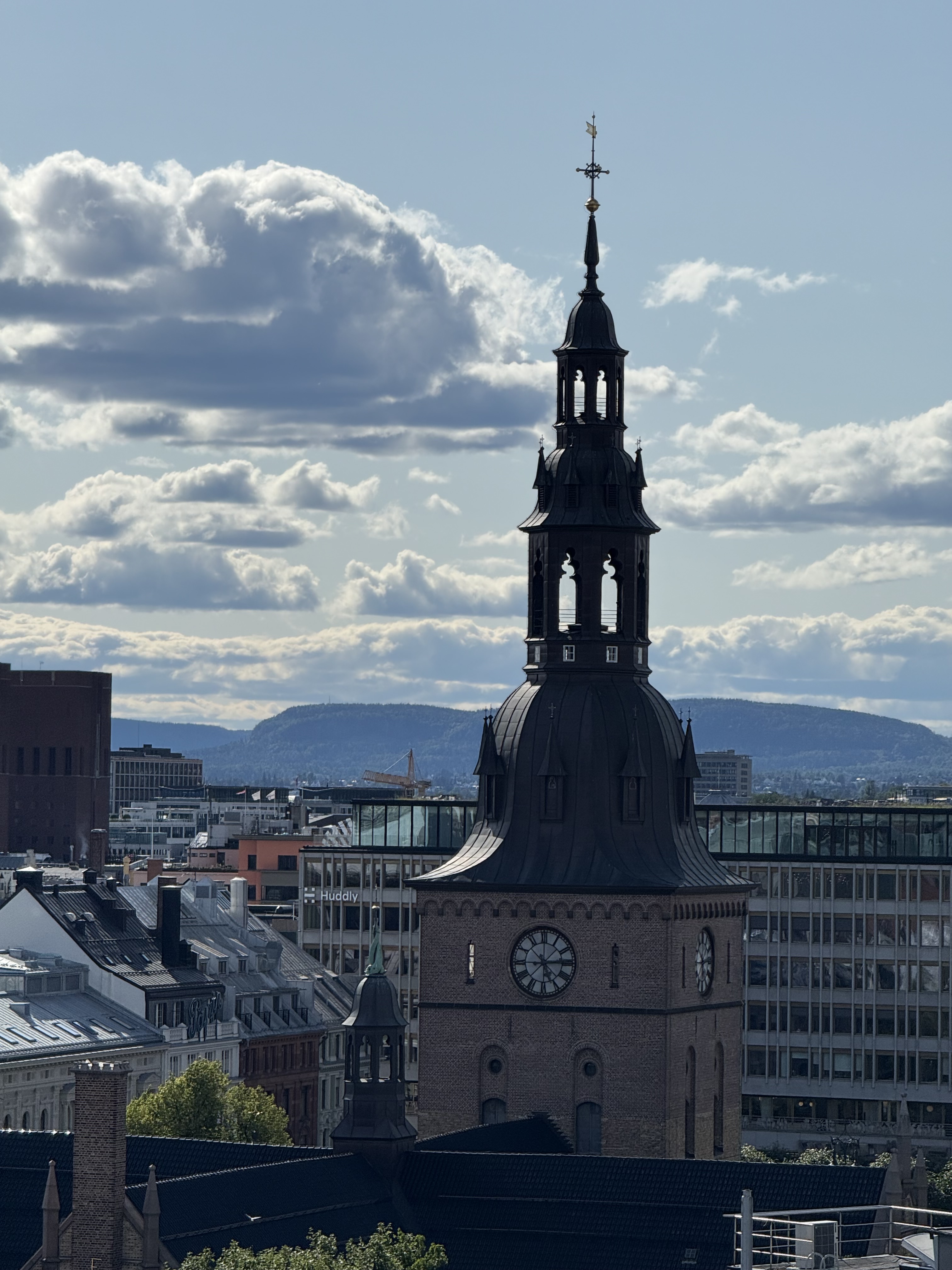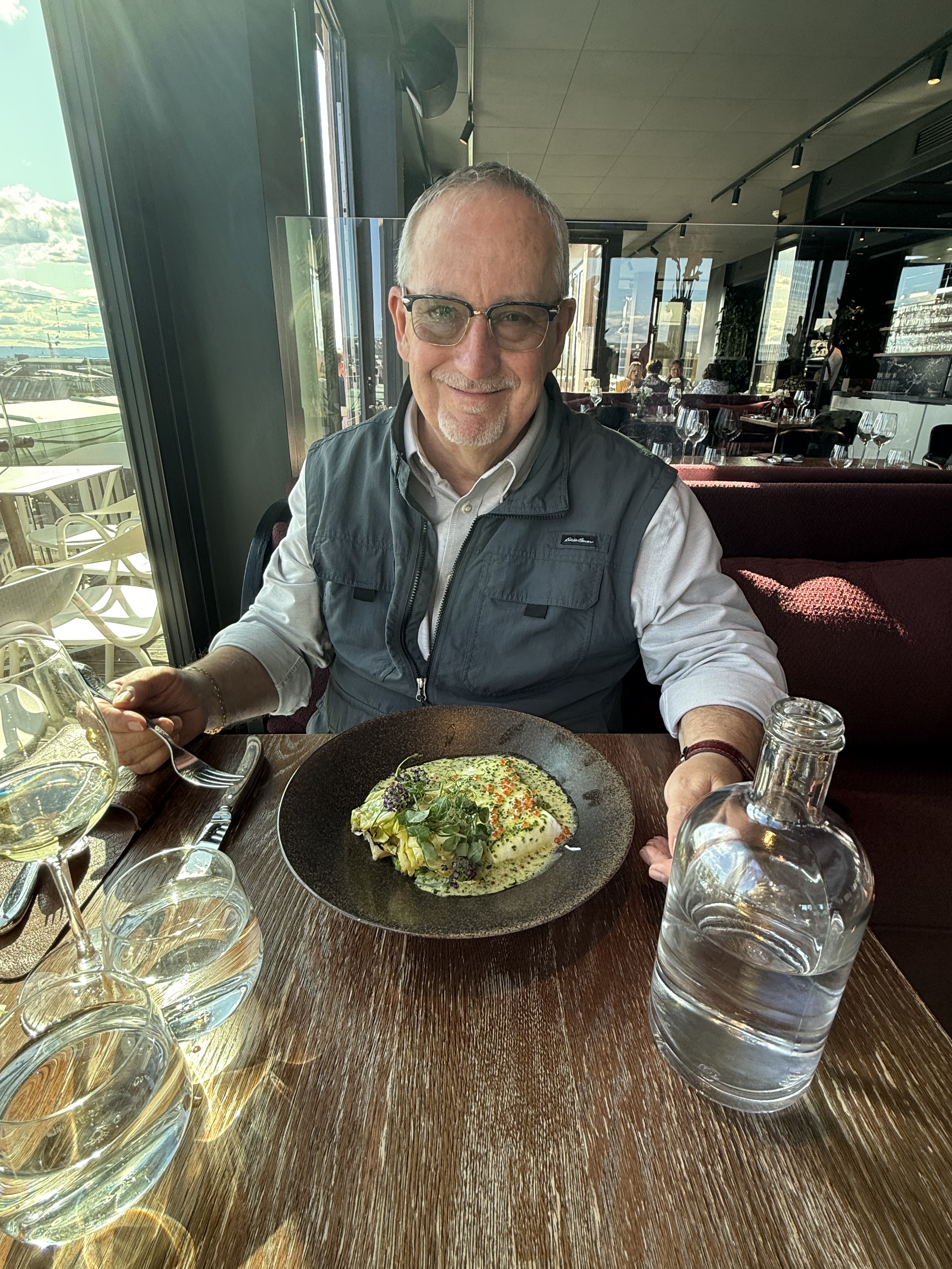 We have arrived in Oslo. It’s a sunny day with blue sky and temps in the mid 70’s. We arrived at the train station and walked across the street to our hotel (Clarion Hotel Oslo). What a great location. Checked into our room and decided to go to an early dinner since we did not have lunch. Our hotel had a restaurant on the top floor with a spectacular view of downtown Oslo. We had a delicious dinner and really enjoyed watching the motion of people, trains and trolley’s and we watched from our dinner table. As we looked out the window, we started planning where to walk this evening.