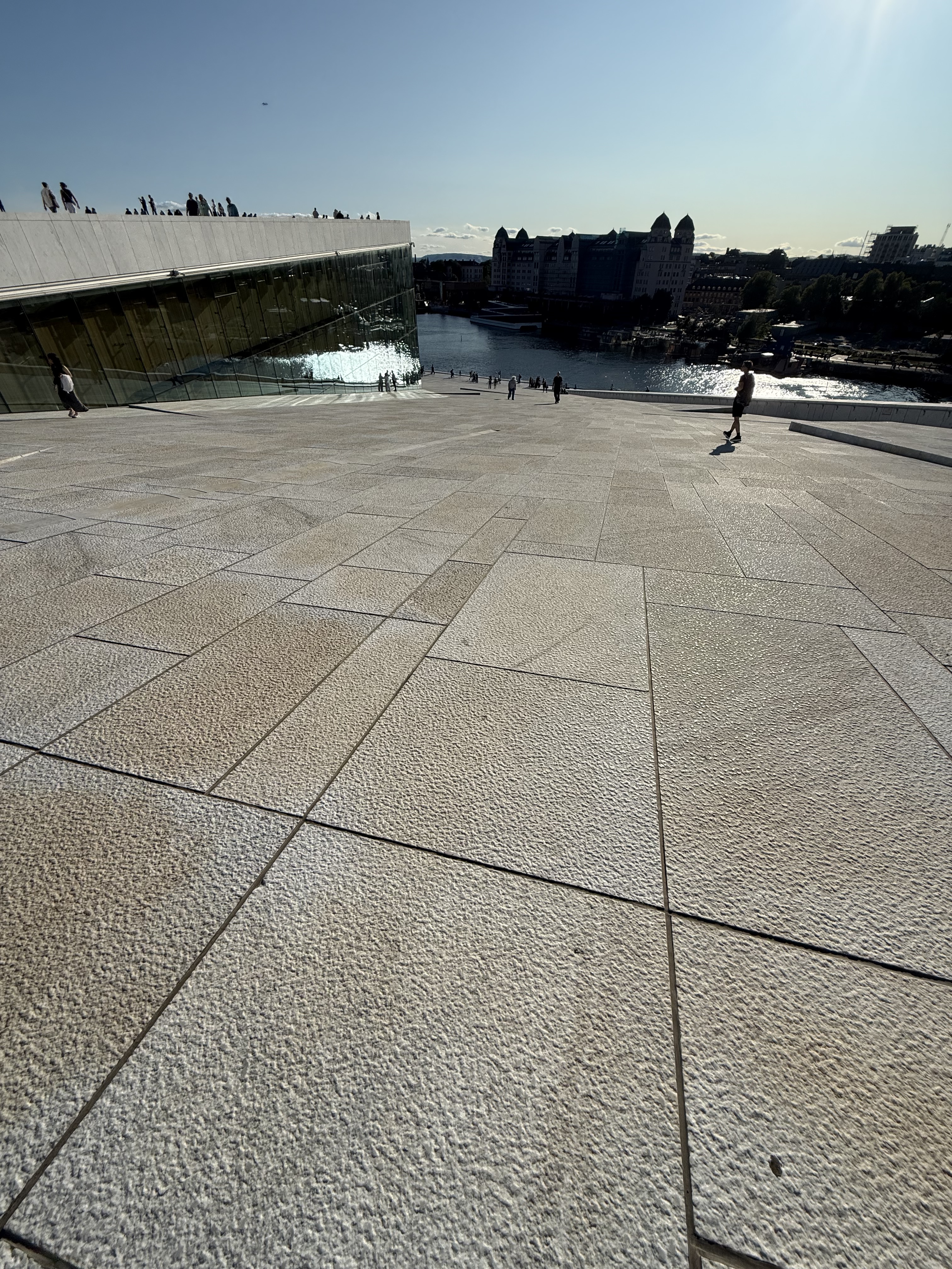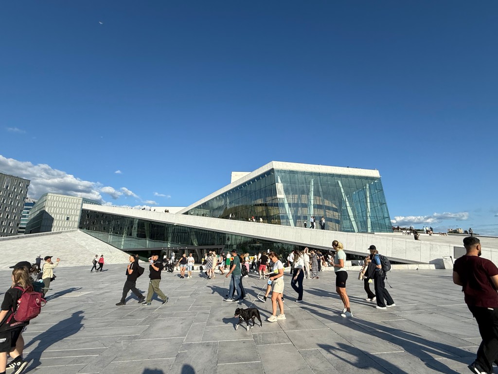 We headed right towards the Opera House. A huge building covered by Carrara marble from Italy. The building appears to rise out of the water, as if it were an iceberg. The structure contains 1,100 rooms in a total area of 530,000 sq ft. The main auditorium seats 1,364. It’s the largest cultural building constructed in Norway since Nidarosdomen was completed in 1300.